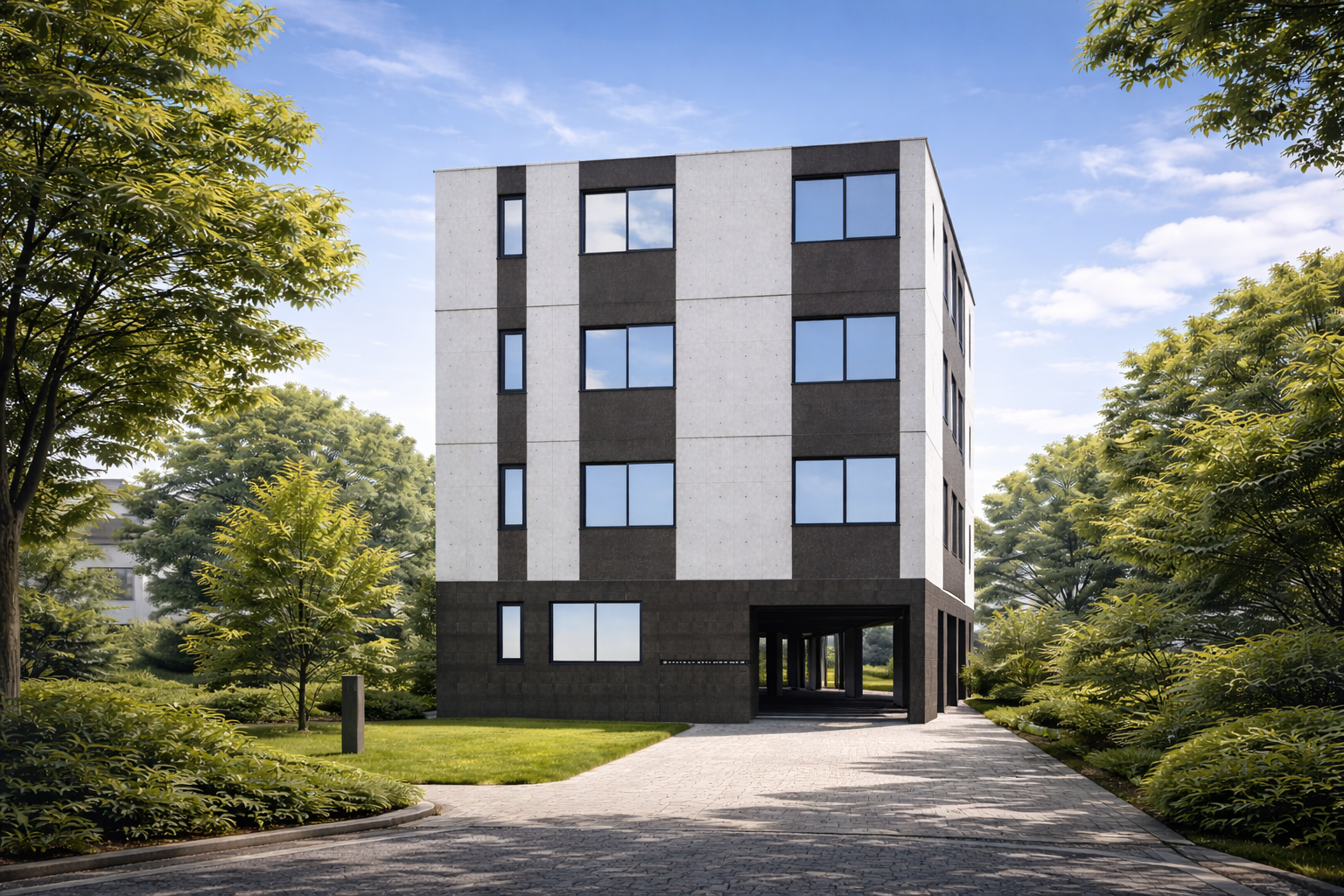 2階以上は開口部に4階まで縦に並ぶ窓へグレーのアクセントカラーを施し、外観に縦ラインのリズムを与えたファサードデザインです。