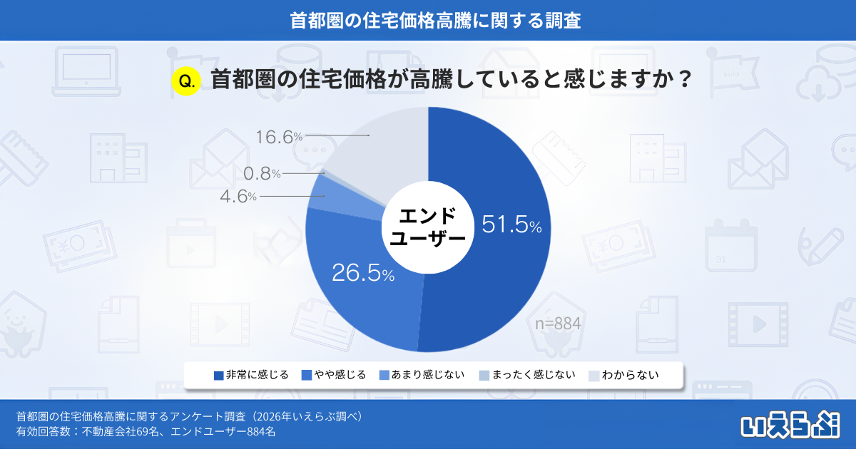 エンドユーザーに「首都圏の住宅価格が高騰していると感じますか?」と質問したところ、「非常に感じる」(51.5%)、「やや感じる」(26.5%)、「あまり感じない」(4.6%)、「まったく感じない」(0.8%)、「わからない」(16.6%)という結果となりました。