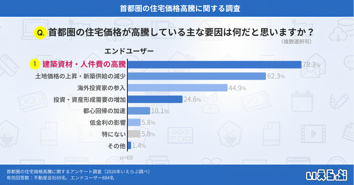不動産会社に「首都圏の住宅価格が高騰している主な要因は何だと思いますか?」と質問したところ、「建築資材・人件費の高騰」が78.3%で最も多く、次いで「土地価格の上昇/新築供給の減少」が62.3%、「海外投資家の参入」が44.9%という結果となりました。