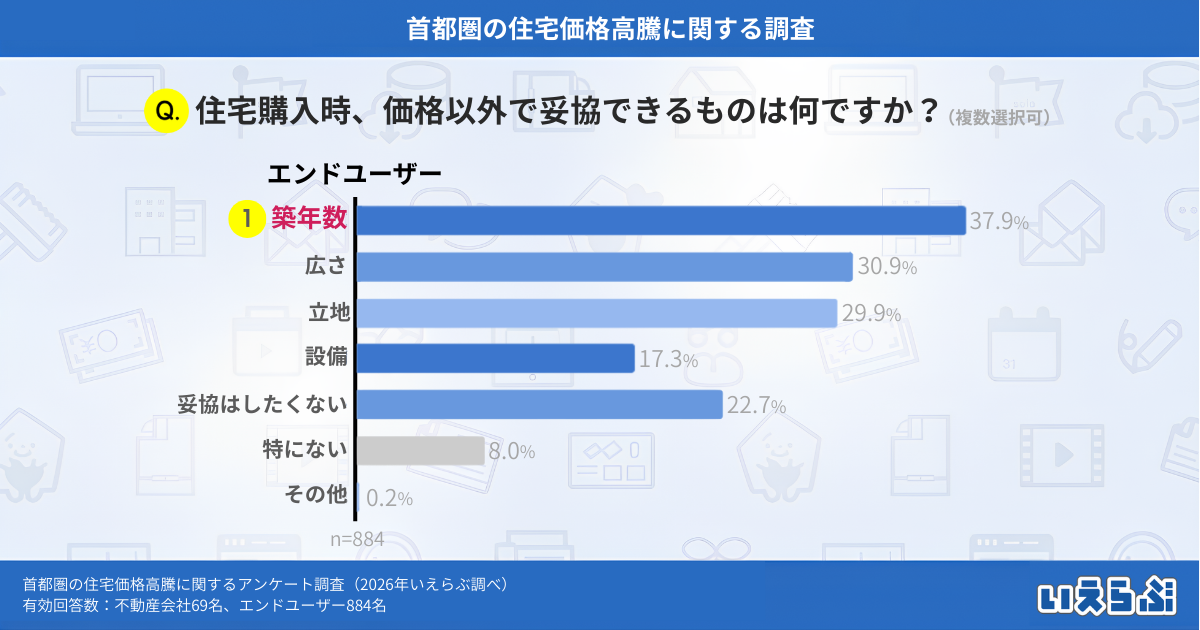 住まい探しへの影響についての回答を受け、エンドユーザーに「住宅購入時、価格以外で妥協できるポイントはどこですか?」と質問したところ、「築年数」が37.9%で最も多く、次いで「広さ」が30.9%、「立地」が29.9%という結果となりました。