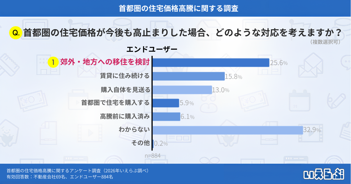 「首都圏の住宅価格が今後も高止まりした場合、どのような対応を考えますか?」という質問では、「わからない」が32.9%で最も多かったものの、「郊外・地方への移住を検討する」(25.6%)、「賃貸に住み続ける」(15.8%)、「購入自体を見送る」(13.0%)といった回答も挙げられました。