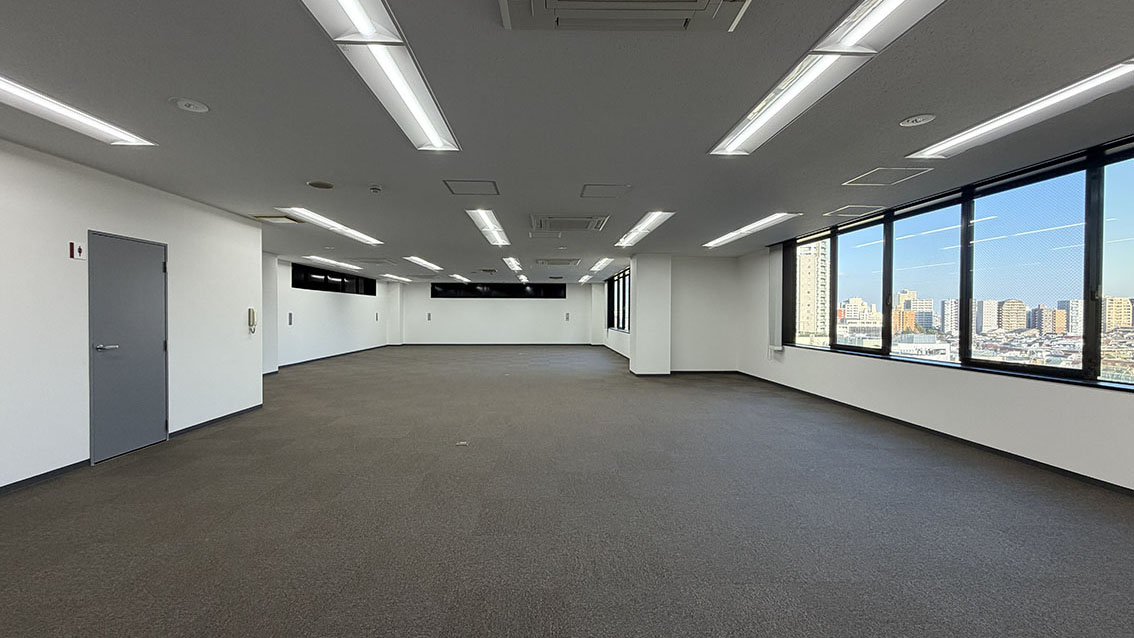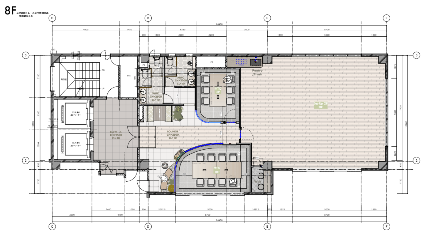 エントランスおよび共用部については、本物件取得時に既に一定のリノベーションが施されており、築年数を感じさせないクオリティを有しています。当社ではその既存価値を生かしつつ、専有部の再生を実施。8階部分をセットアップオフィスとして再構築し、入居後すぐに事業を開始できる環境を整えました。