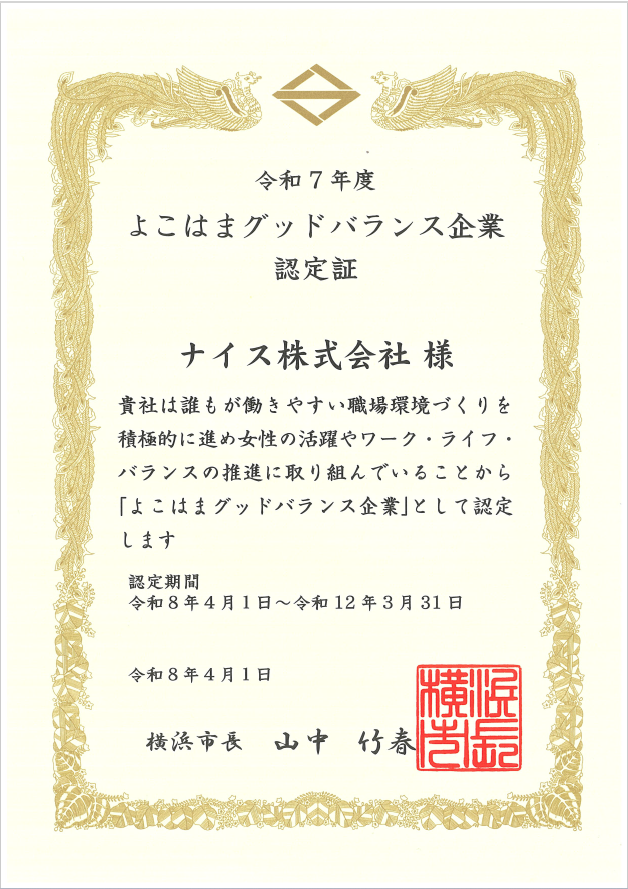ナイス株式会社(本社:横浜市鶴見区、社長:津戸 裕徳)はこの度、女性の活躍やワークライフバランスを推進する企業として、横浜市より「よこはまグッドバランス企業」に認定されましたので、お知らせいたします。