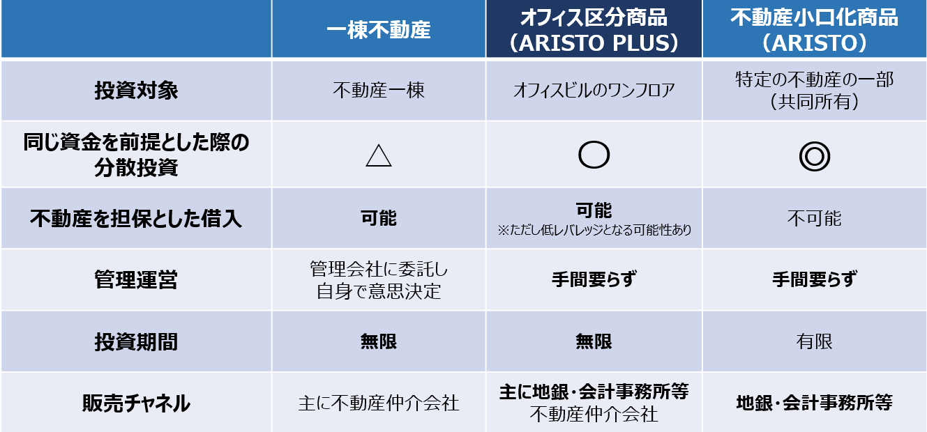 オフィス区分商品「ARISTO PLUS」は、都心の中小型オフィスビルを敷地利用権付の区分建物として独立した所有権に分割し、ワンフロア単位で販売する不動産投資商品です。