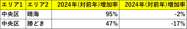 しかし2025年になると状況は一転し、再販マンション増加率は前年比マイナス2%となりました。特に「晴海」「勝どき」といった湾岸エリアでは、再販投資が急速に減速する動きが見られています。