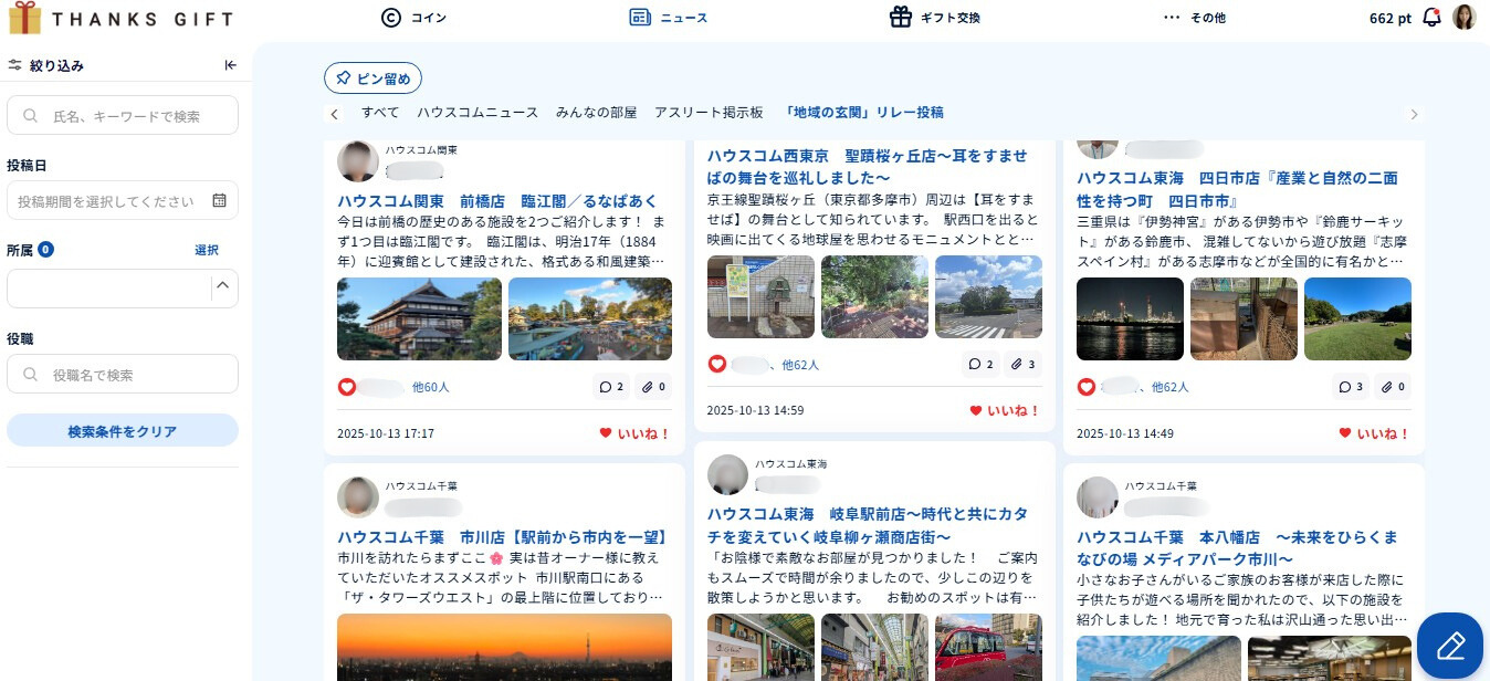 ハウスコムは2024年9月より、従業員同士が日々の感謝や応援の気持ちをコインとして贈り合う社内コミュニケーションプラットフォーム「THANKS GIFT」を導入しています。現在、全国240店舗以上、約1,200名の従業員が利用しており、利用率はほぼ100%、稼働率は直近の2月時点で74%と、多くの従業員に日常的に活用されています。