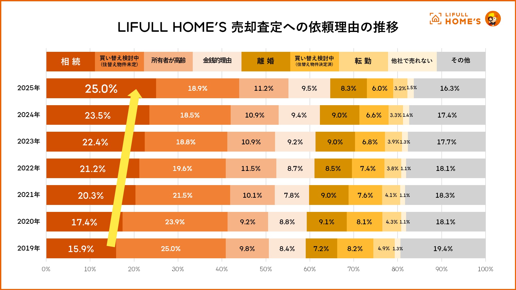 ご両親の逝去や介護施設への入居などを契機として相続・管理する不動産=実家を売却することを前提に査定に出すケースが年々増加しています。毎年LIFULL HOME’Sに寄せられる売却査定依頼も件数自体が増加しているだけでなく、その中で「相続」を理由としたものが2025年には25.0%に達し、3年連続して最多シェアを占有。まさに団塊の世代が全員75歳以上の後期高齢者となり、本格的に“大相続時代”に突入していることを反映したものと言えます。
