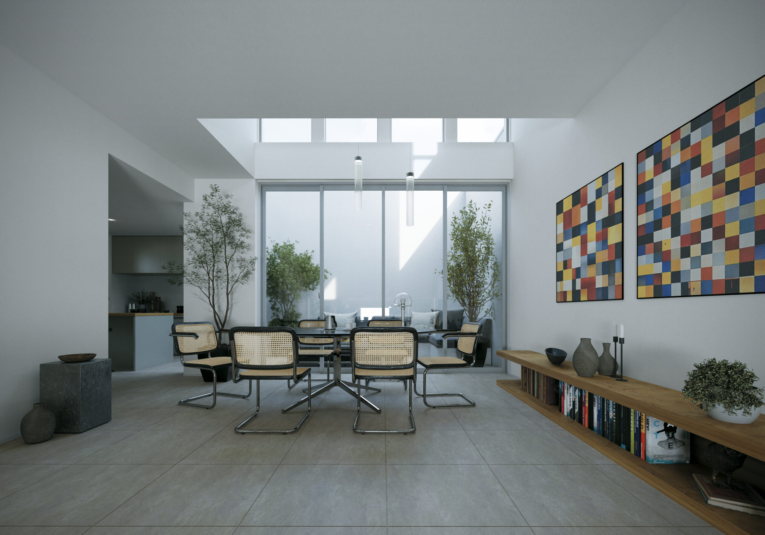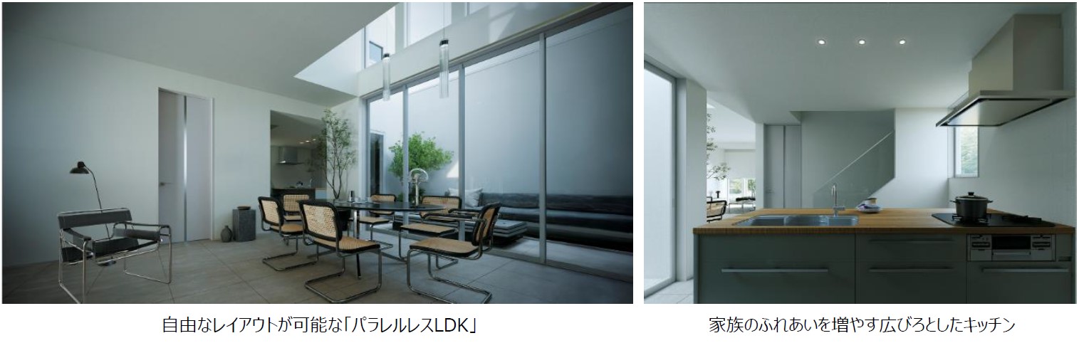 1階は大きなワンルームのパブリックスペース「パラレルレスLDK」。大開口に面して吹き抜けを設け、ノースガーデンともフラットにつながり、垂直・水平方向に広がりを感じさせる空間です。リビング・ダイニングには方向性を持たせず家具を自由にレイアウトすることで、住まい手が自分好みの居場所をつくることができます。