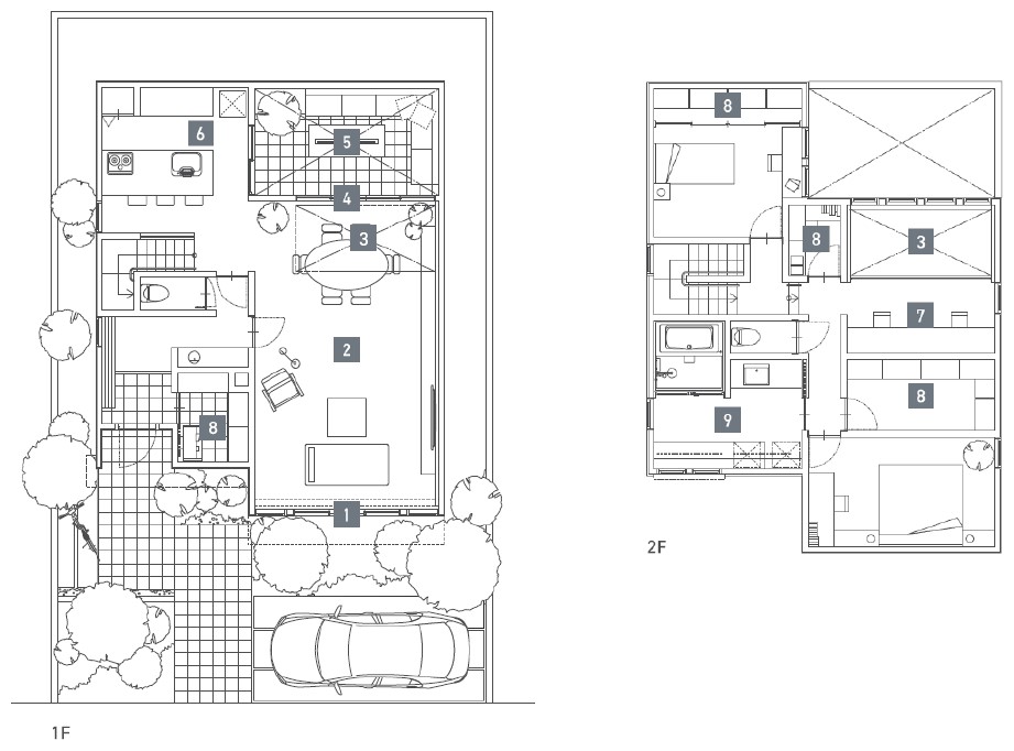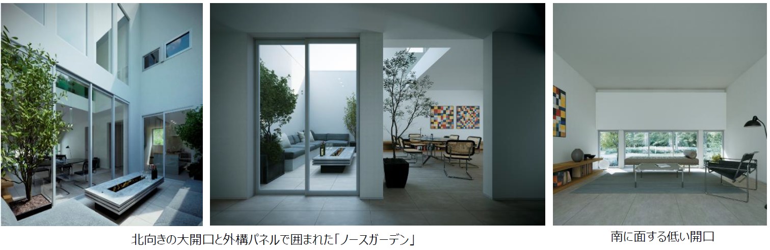 本プランの最大の特徴は、北側に大きく開いた窓と、外構パネルで囲まれた「ノースガーデン(北庭)」です。北向きの大開口は直射日光を避け、暑さ・眩しさを防ぐことができるため、カーテンを開けたまま一日を快適に過ごすことができます。南向きの開口でカーテンを併用する場合と同等の健康的な明るさ※1を、北向きの大開口でも十分に得られるというシミュレーション結果も出ています。※2また、外構パネルが周囲からの視線を遮るため、カーテンを閉めずに開放的に過ごせるプライベートな外部空間を実現。夏でも日陰で涼しく、子どもの遊び場としても最適です。相対する南側の窓はあえて低く抑え、2階のボリュームを張り出して強い日射を遮ります。さらに、南の下方から風を取り込んで北の高い窓へと風を抜く、微気候設計を採用しました。また、室内から室外への視線をコントロールして電線や街灯などのノイズをカットすることで、住まいに視覚的な静寂をもたらします。
