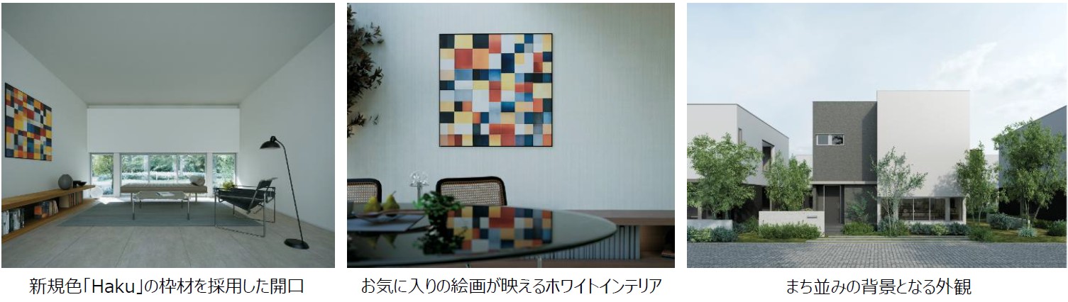 リビング・ダイニングは開口を南北のみに絞り、東西面は壁を広く残すように設計しました。建具や枠材は新規色「Haku(=白)」を採用することで境界のない白い壁面を演出しています。お気に入りの家具や照明、グリーンをコーディネイトして暮らしを楽しめる、ホワイトインテリアが特徴です。