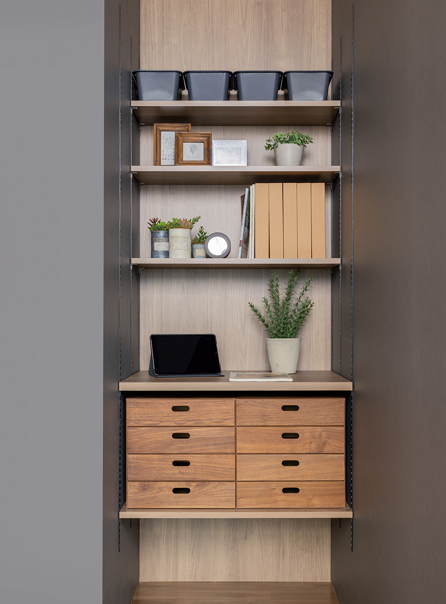 奥行は50mmピッチで、200mmから600mmまでの全9規格、幅は5mmピッチで250㎜から1950㎜までの全341規格、カラーは全9色と圧倒的なサイズバリエーションをラインナップし、あらゆる空間に対応できます。