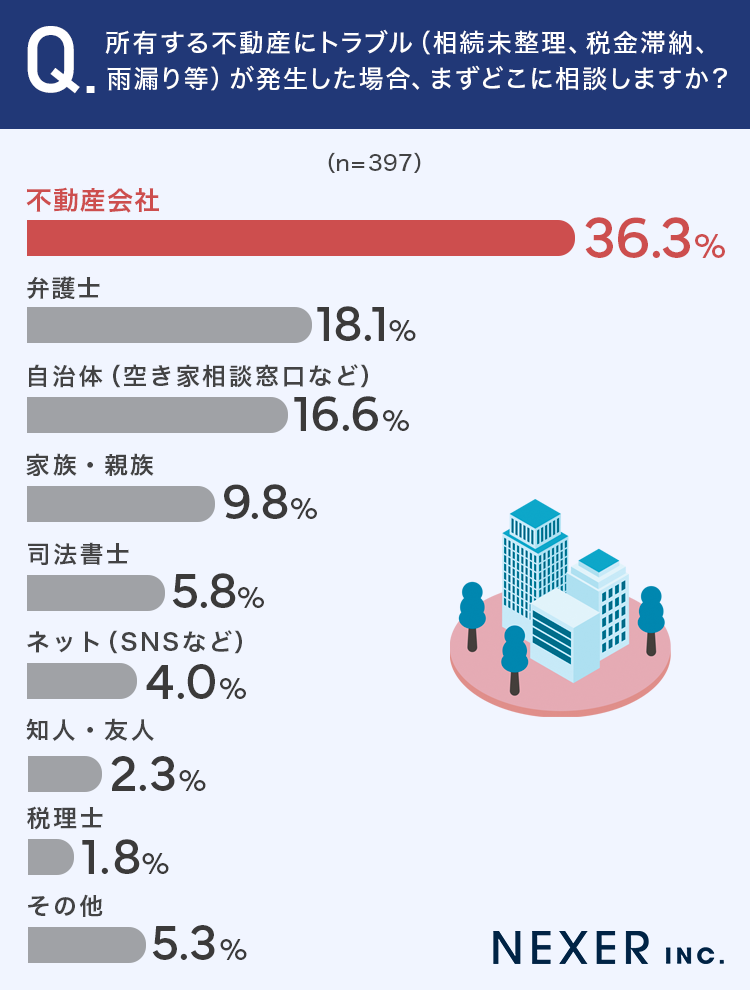 質問4:所有する不動産にトラブル(相続未整理、税金滞納、雨漏り等)が発生した場合、まずどこに相談しますか?