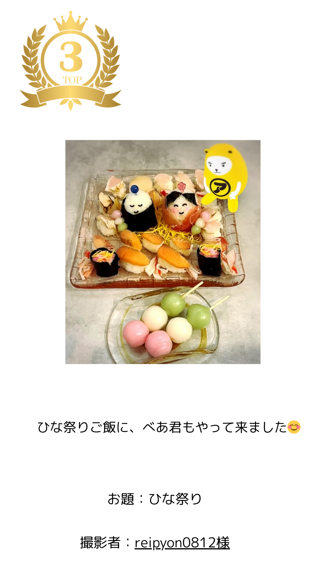 ひな祭りをテーマにした彩り豊かな料理と、そこに現れたべあ~君の組み合わせが楽しい作品です。雛人形をモチーフにした料理や三色団子など、季節の行事を丁寧に表現した構図が印象的で、家庭の温かい時間が伝わってきます。ARキャラクターと日常の食卓を自然に融合させた点が評価されました。