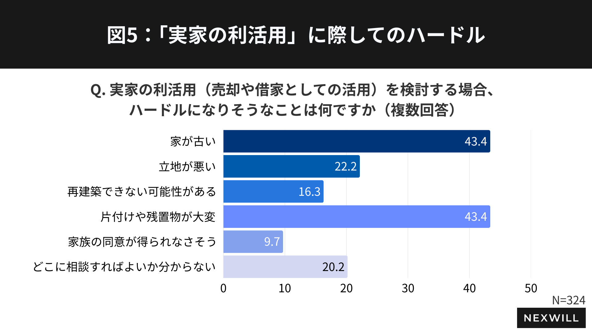 「実家の利活用(売却や賃貸としての活用)を検討する場合、ハードルになりそうなことは何ですか」と尋ねたところ、最も多かった回答は「家が古い」(43.4%)と「片付けや残置物が大変」(43.4%)で、いずれも約4割を占める結果に(図6)。