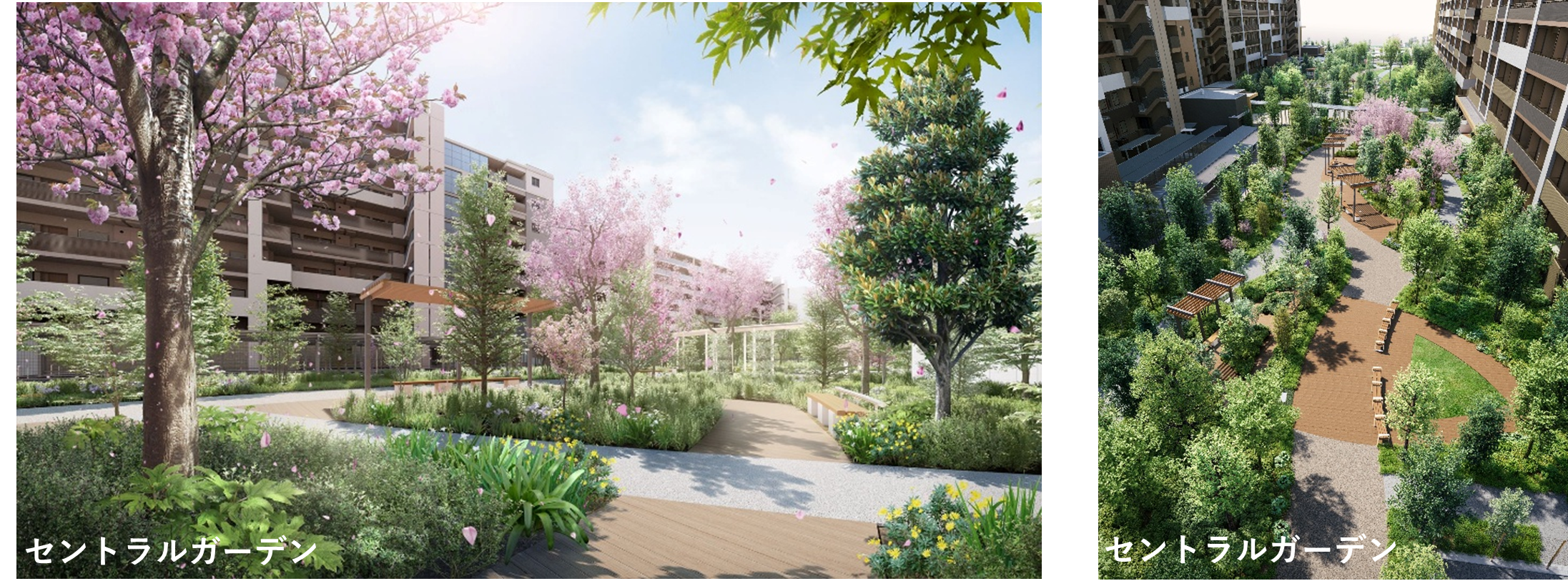 共用部を各棟に配置することで、敷地中央に広がるセントラルガーデンが棟と人をつなぎ、緑豊かな自然の中で交流が生まれる住まいを計画しております。
