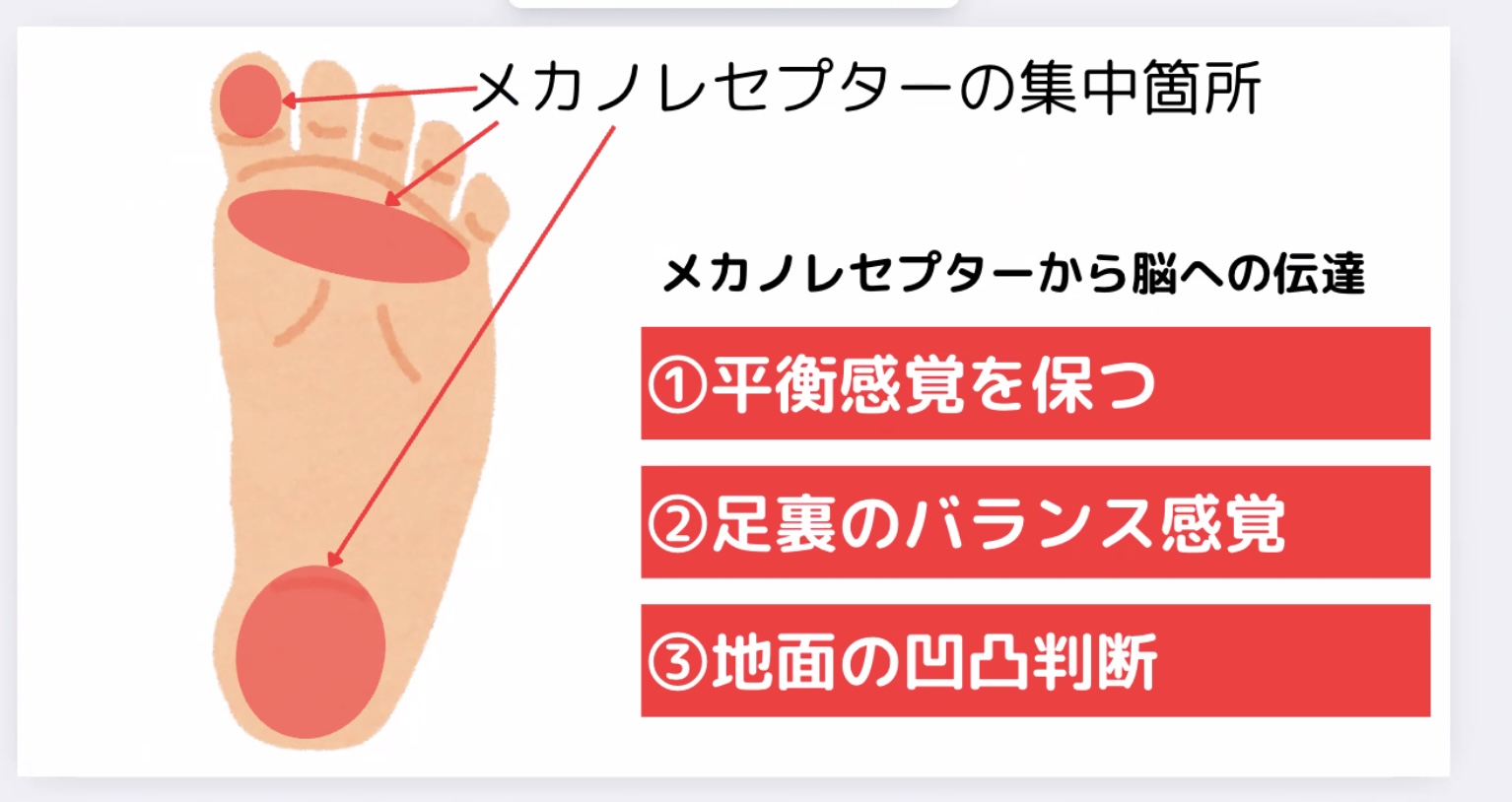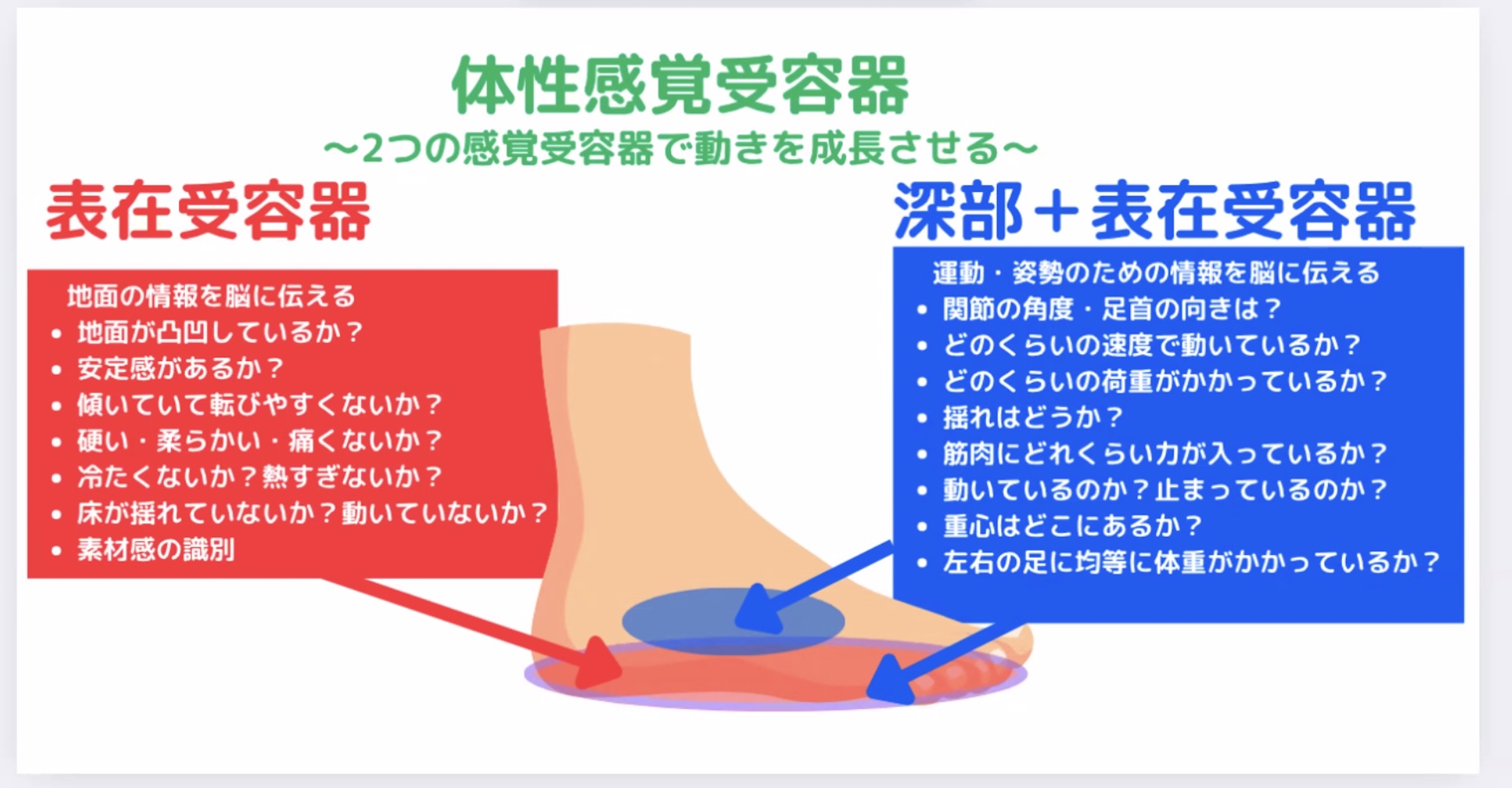 足裏にあるメカノレセプターには2種類あり、表在受容器(皮膚表面で触覚や圧、温度を感じる)