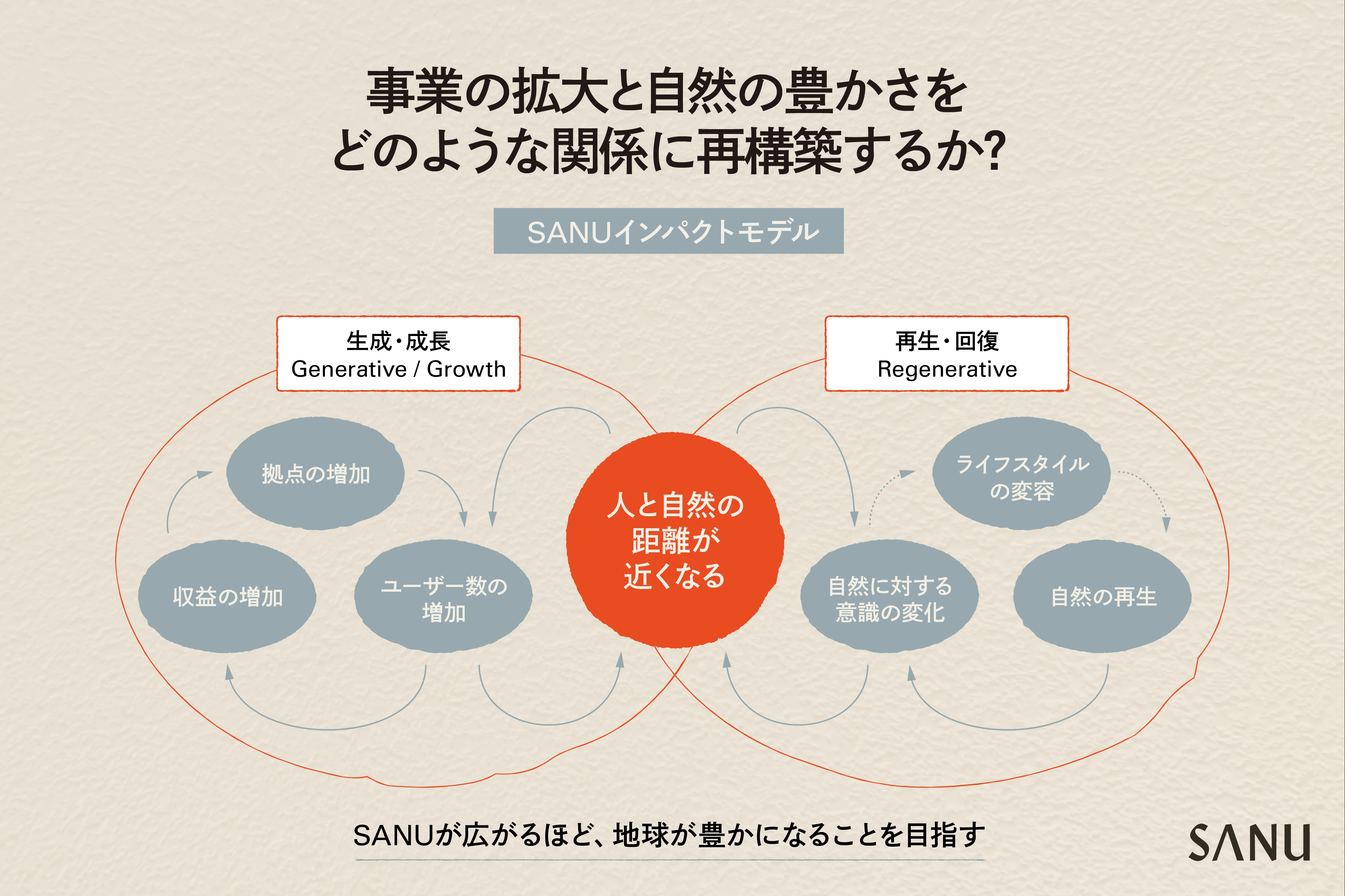 今回、SANUは、事業の成長と自然の豊かさをつなぐ枠組みとして「SANUインパクトモデル」を策定しました。本モデルでは、事業の創出・成長(Generative / Growth)によって「人と自然の距離が近くなる」というインパクトを生み出し、それを起点に自然の再生・回復(Regenerative)の循環を広げていきます。こうした循環を通じて、「SANUが広がるほど、地球が豊かになる」というゴールの実現を目指します。