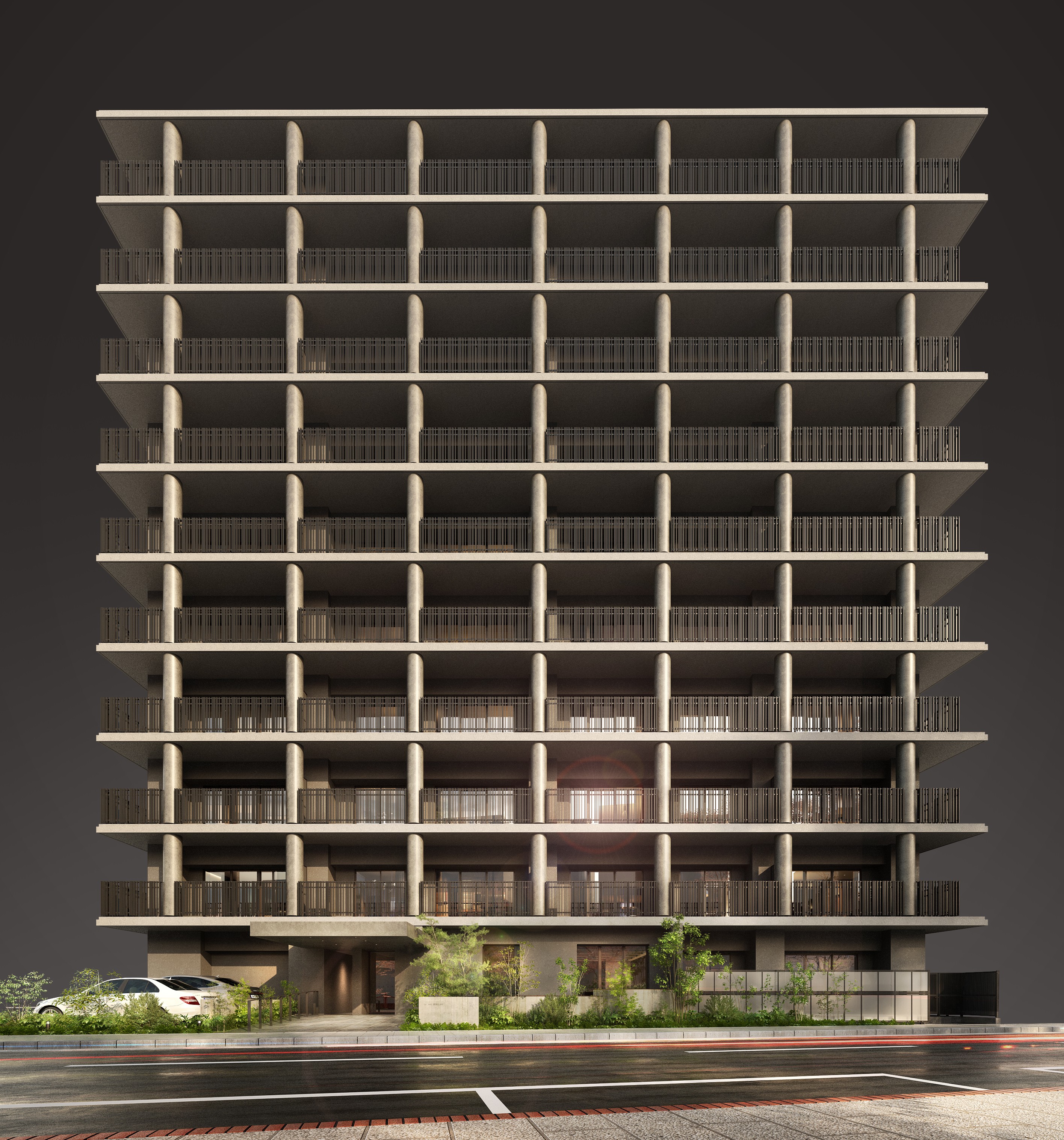 外観は、一定のリズムで配した丸柱が時の移ろいとともに豊かな陰影を描き出しつつ、雨どいを柱の内部に収めることで美しい佇まいを追求しました。 さらに、バルコニーを建物の側面へと延伸させることで建物全体の圧迫感を軽減し、端正な格子状のラインよって秩序と品格のあるデザインとしました。