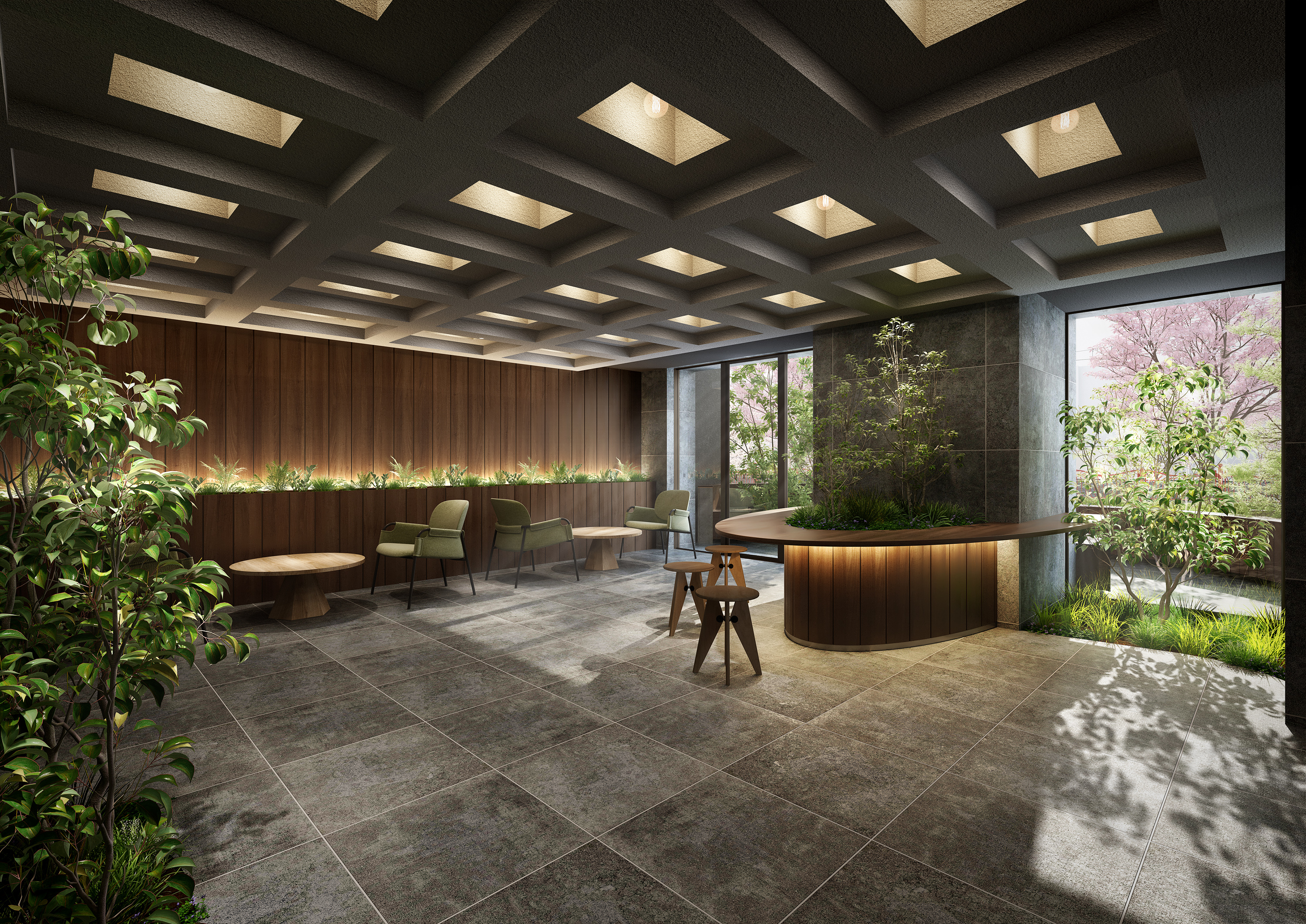 迎賓の場となるラウンジは、天井にワッフルスラブ状の格子の意匠を施しており、クラシカルな重厚さと現代的な軽やかさが調和するデザインを採用しました。