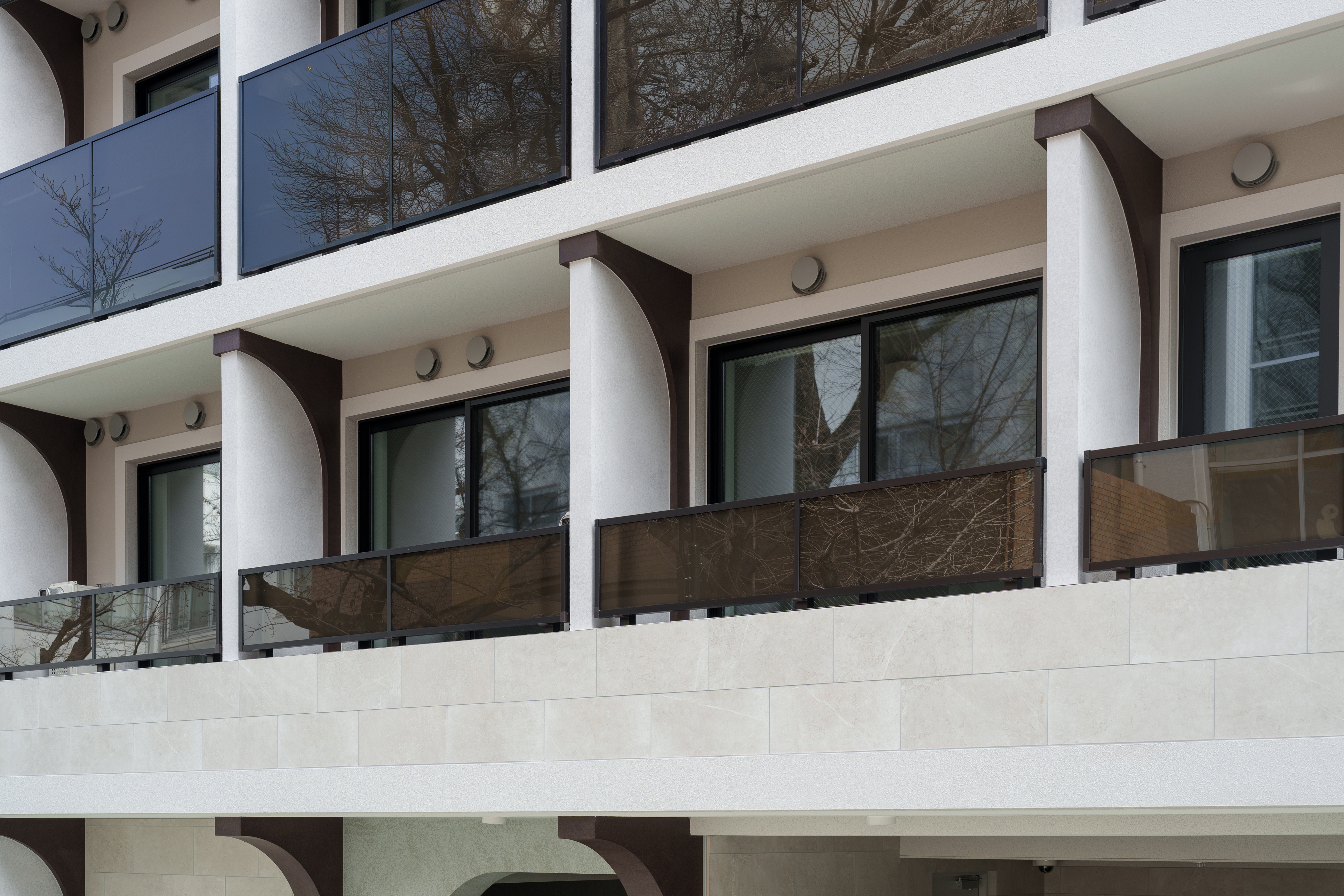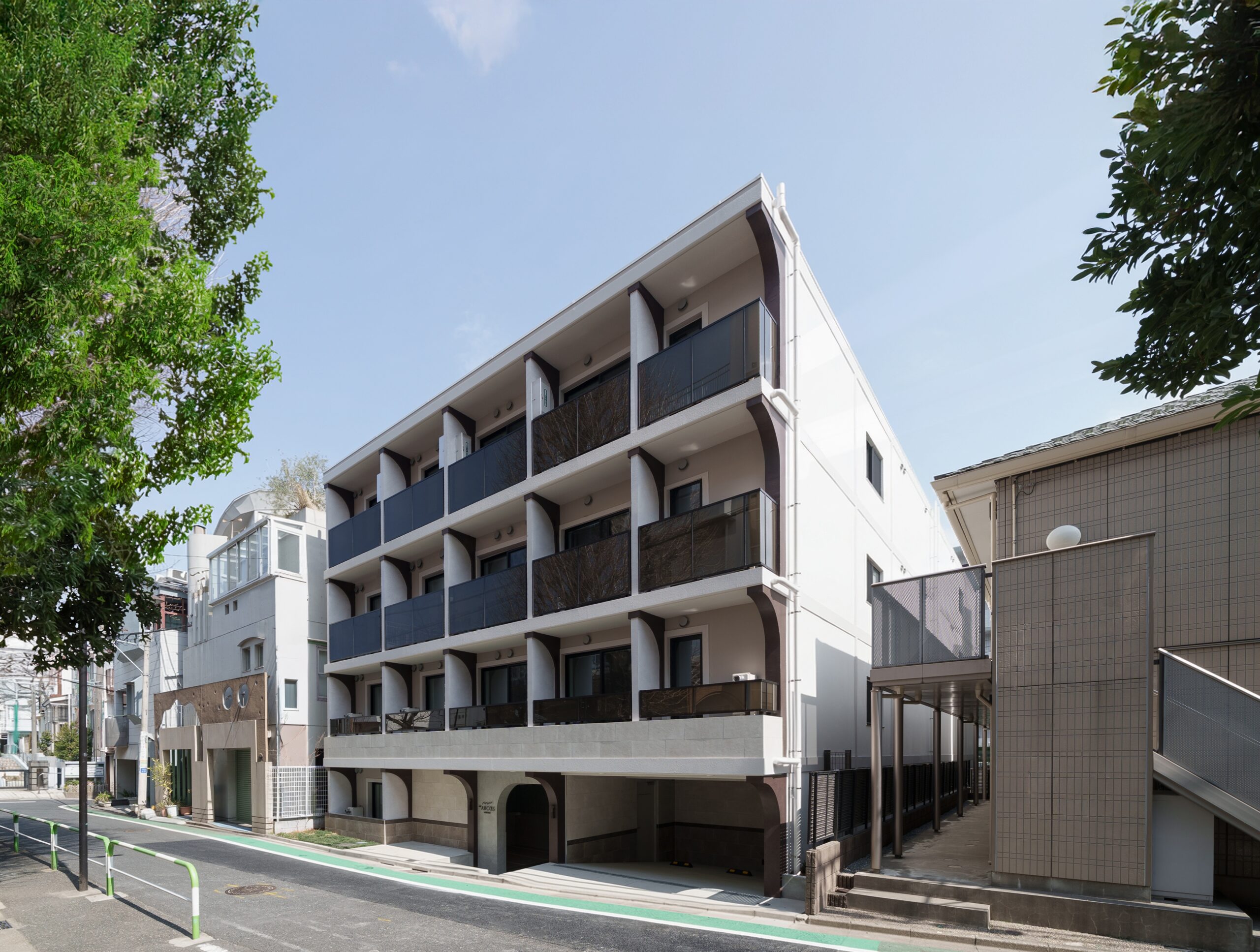 デザインを監修した鎌倉氏は、建築意匠に込めた思いを次のように語りました。「本物件のデザインは、サグラダ・ファミリアなどに代表されるガウディ建築のアーチや梁が生み出す構造美をベースに、現代的な解釈を加えて設計しました。建物の随所にハーフアーチのモチーフを取り入れることで、シャープさを持ちながらも素材感や光の入り方によって緊張感をやわらげ、温もりを感じられる外観を表現しています。」