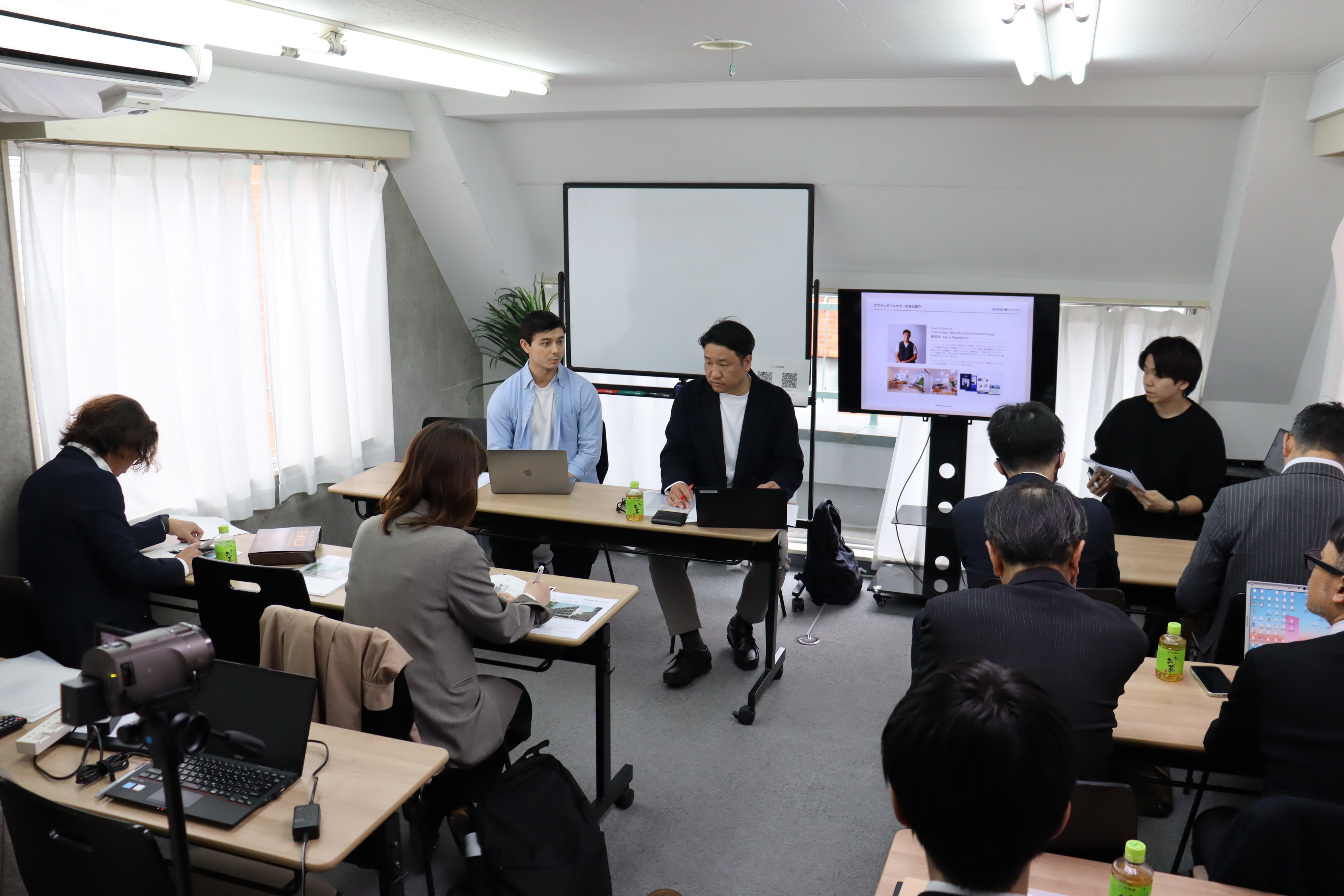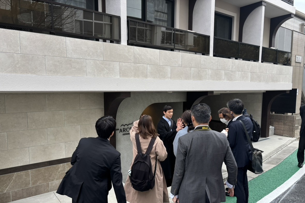 本物件の竣工を記念し、3月19日(木)に「LOS ARCOS千駄木」のメディア向け内覧会を実施しました。当日は、明豊エンタープライズ執行役員事業企画室長の杉本 圭司および、本ブランドのデザインを監修した株式会社INTERPLAYクリエイティブ&デザインディレクターの鎌倉 彬氏が登壇。