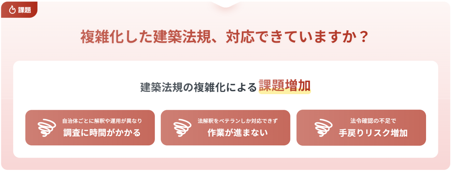 建設・建築業界では、自治体ごとに異なる条例・手続きや高度な専門解釈を要する法令に加え、省エネ基準強化や社会情勢の変化により法改正が頻繁に行われる中、その全体像を現場の設計者が正確に把握し続けることはますます困難になっています。