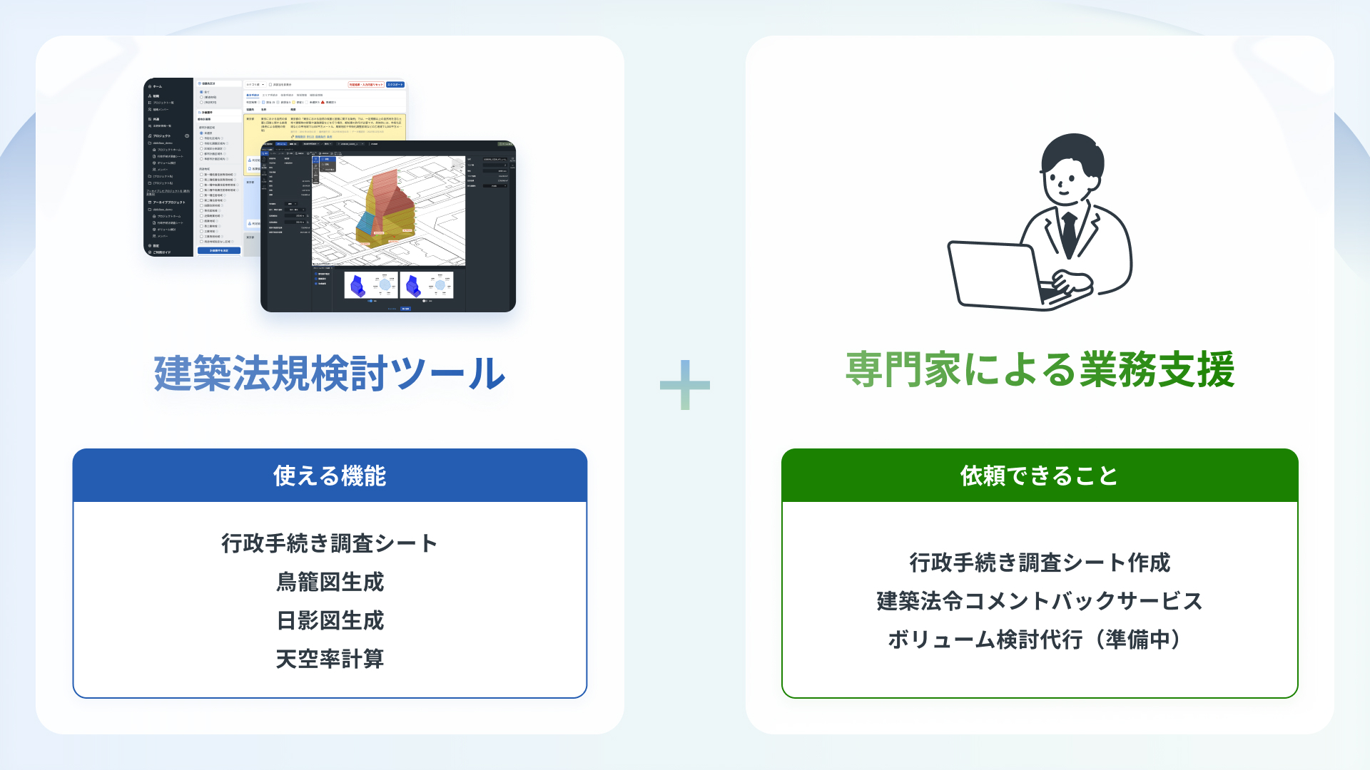 DDDDboxは、建築設計の専門家チームが開発・運営を行う「建築法規検討業務」のアシストサービスです。「法規検討ツール」と「専門家チームによる業務支援」により、複雑化する法規対応の負担を減らし、効率化を支援します。