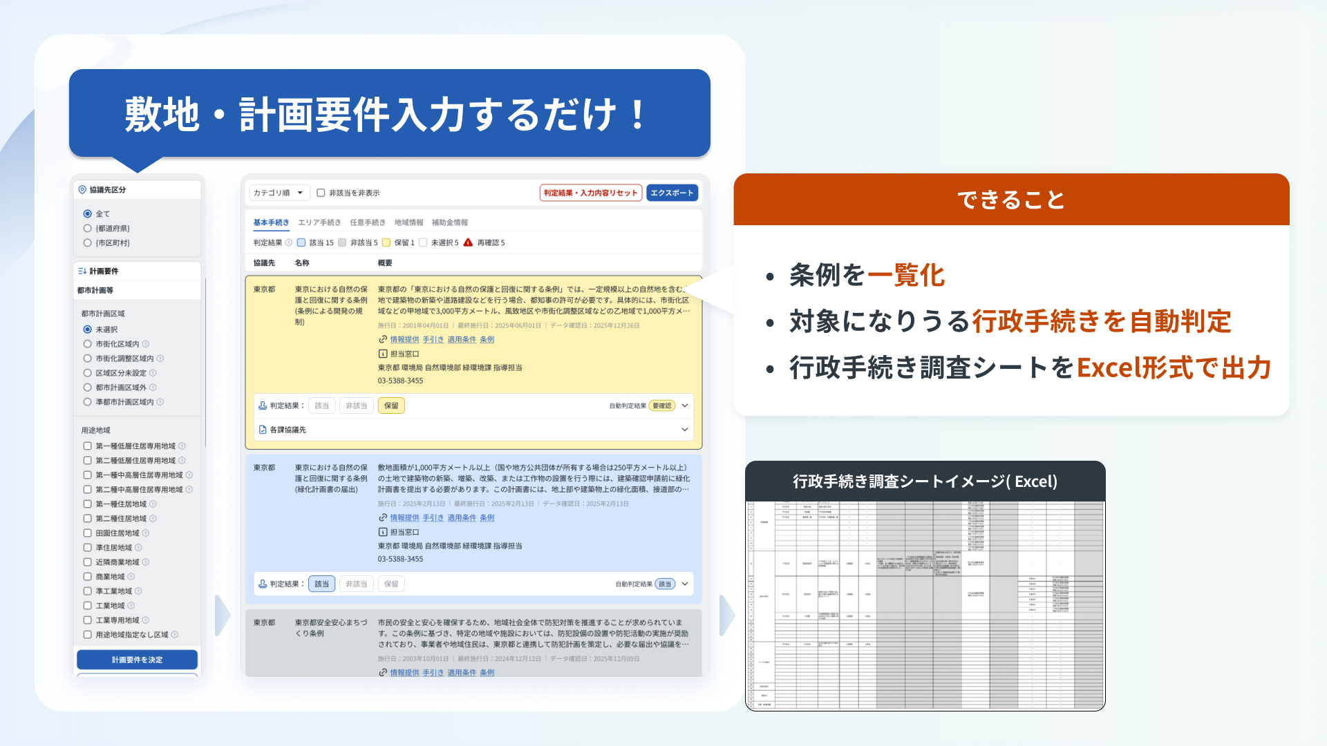 専門チームが監修・データベース化した情報をもとに、指定した敷地の自治体に関する条例を一覧化します。さらに設計要件を入力することで、各手続きの該当・非該当を自動判定。設計者はこれを活用することで、複雑な条例情報を効率的に整理できます。 また、判定結果や個別のコメントをまとめた「行政手続き調査シート」をExcel形式で出力でき、そのまま役所調査にご活用いただけます。