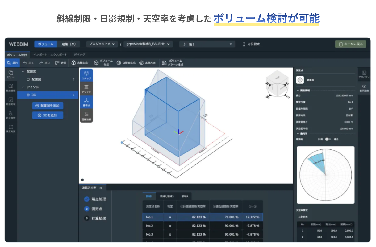 「法規検討ツール」では、行政手続きのための調査を効率化する「行政手続き調査シート」機能や、鳥籠生成や日影図生成、天空率計算などのボリューム検討機能など、企画検討段階の法規検討業務をアシストいたします。