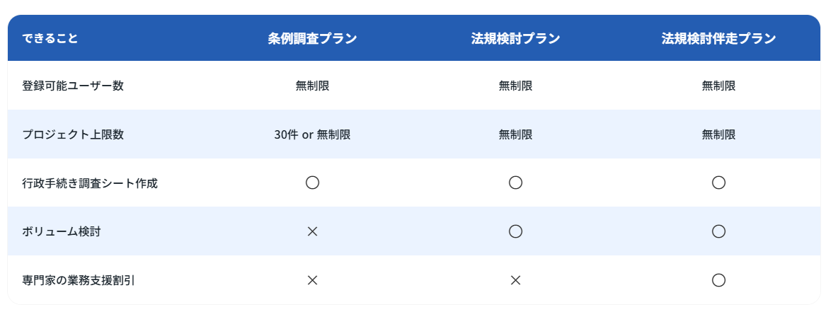 条例調査に関する機能のみをご利用可能なプランと、ボリューム検討含む全ての機能がご利用可能なプランに分かれており、合計4種類ございます。具体的な料金、プランの詳細についてはお問い合わせください
