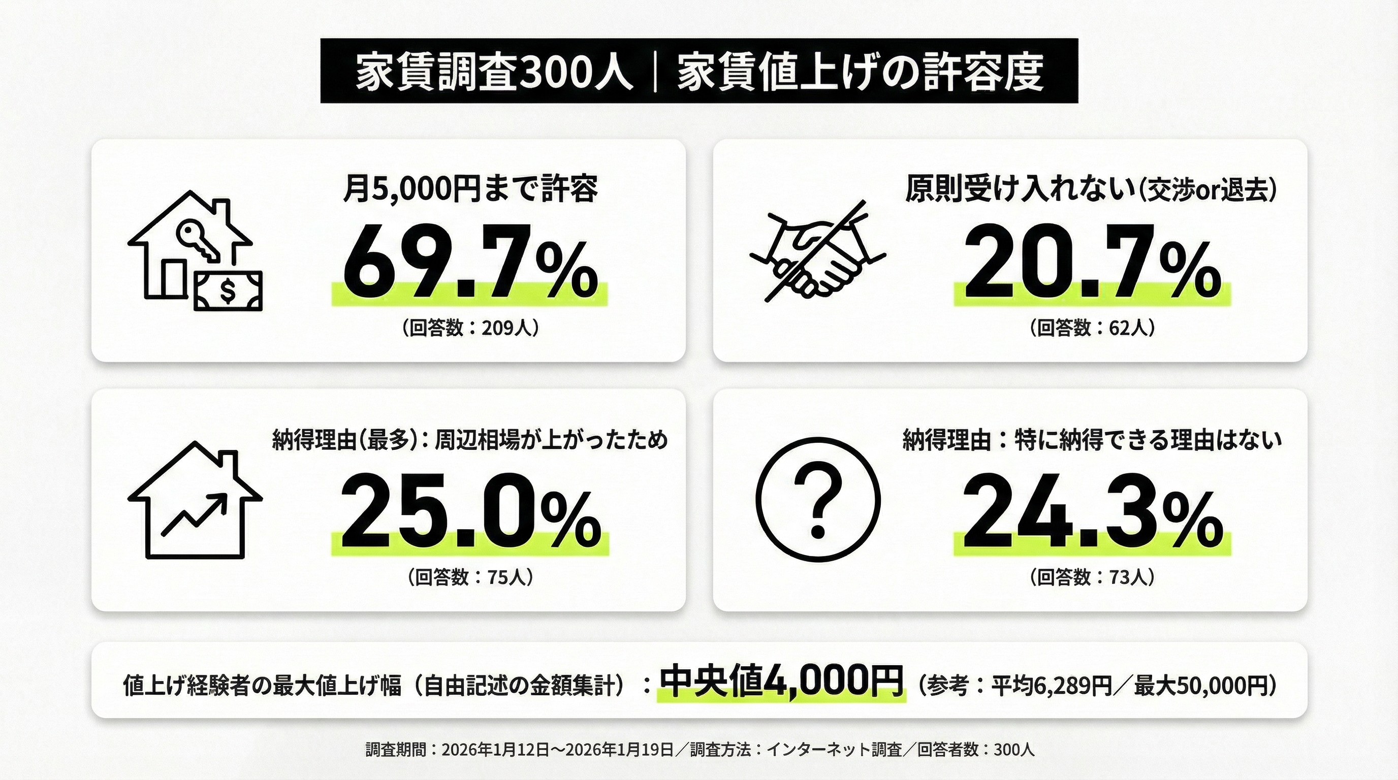 家賃調査300人:値上げ許容は月5,000円まで69.7%(209人)――一方、2割が原則受け入れない(交渉or退去)20.7%(62人)。納得理由は周辺相場25.0%(75人)も、特に納得できる理由はない24.3%(73人)が拮抗