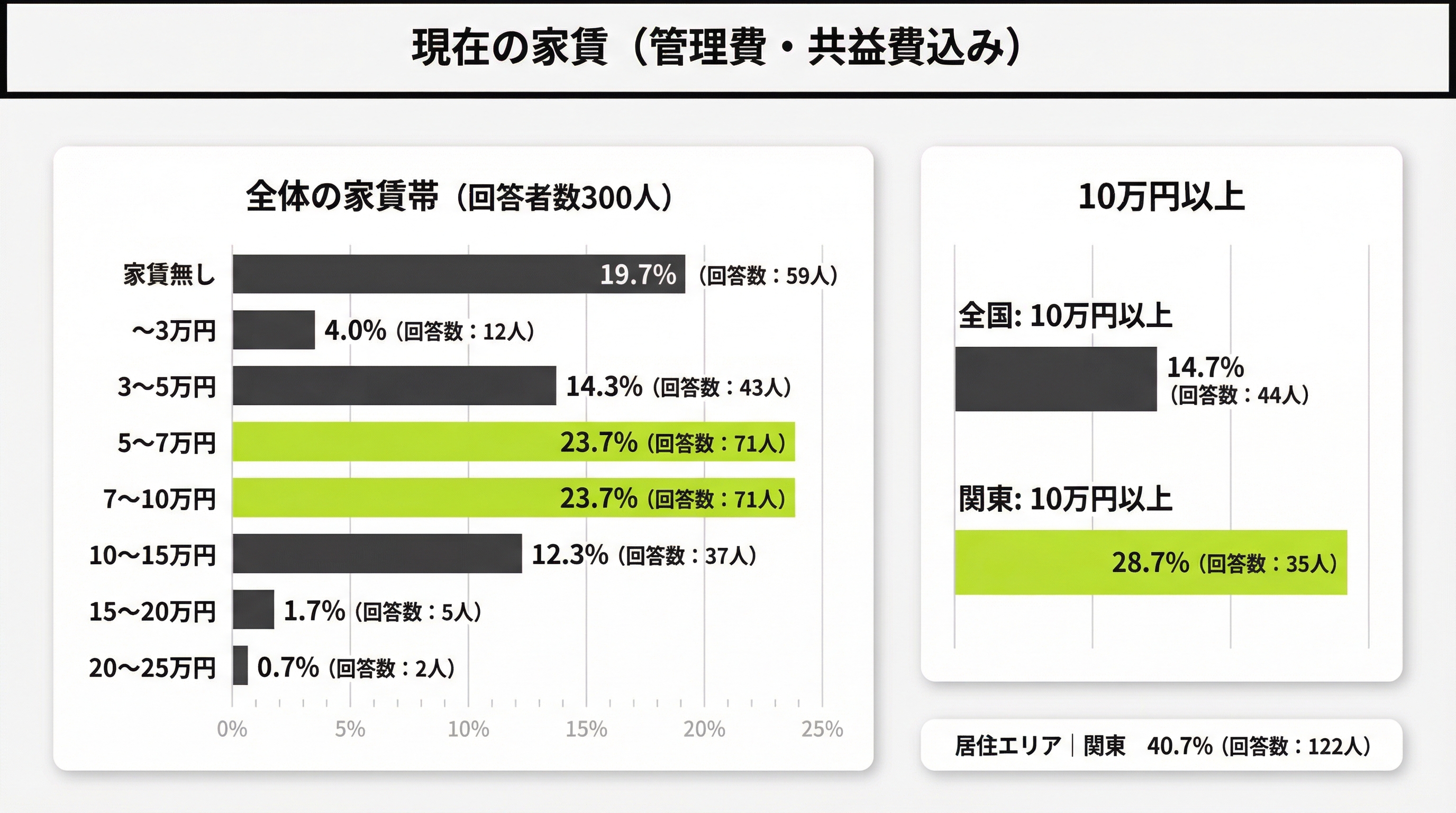 また10〜15万円12.3%(37人)など、10万円以上は合計14.7%(44人)。関東に限ると10万円以上が28.7%(35人)となり、エリアによる家賃負担感の差もうかがえます。