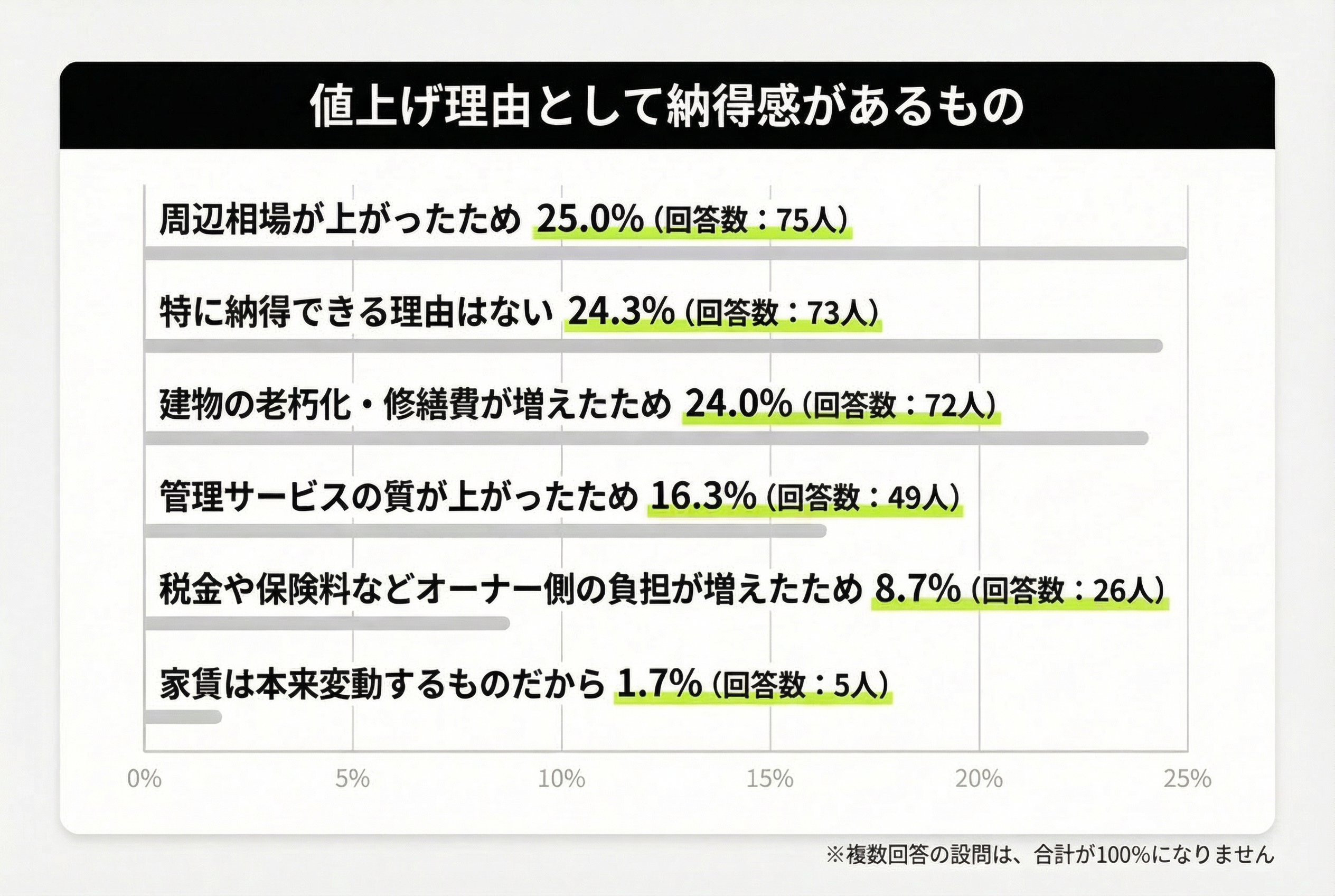 一方で、特に納得できる理由はないが同率で並ぶ点は極めて重要です。およそ4人に1人が、どんな理由を示されても納得できない――家賃の値上げそのものに強い拒否感を持っている実態が浮かび上がります。