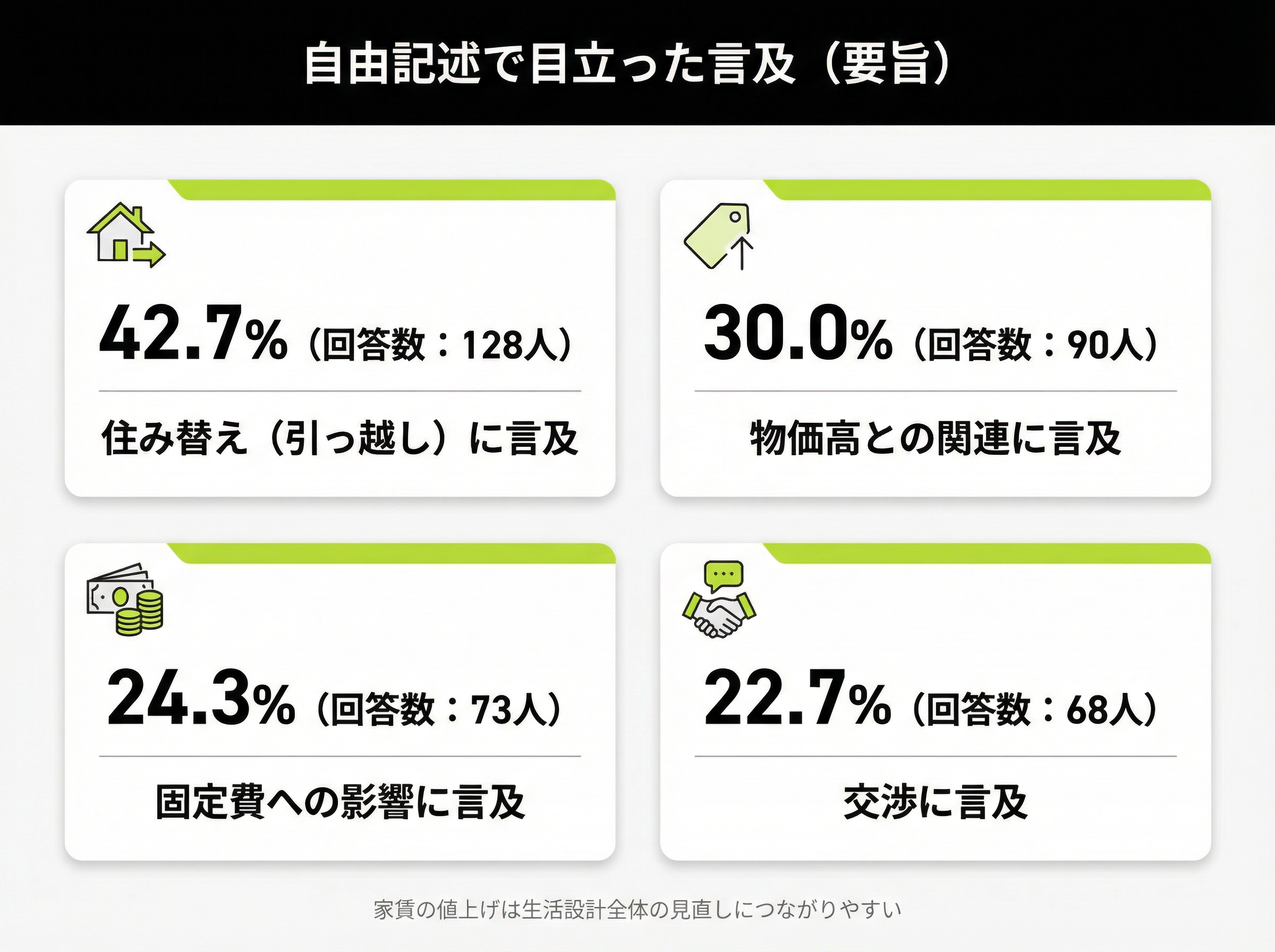 住み替え(引っ越し)に言及:42.7%(128人) 固定費への影響に言及:24.3%(73人) 交渉に言及:22.7%(68人) 物価高との関連に言及:30.0%(90人) 自由記述に見られた主な声(要旨)