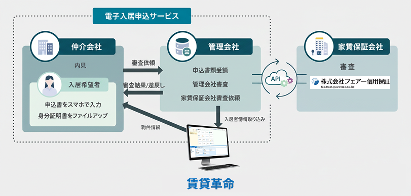入居申込をオンラインで完結できる日本情報クリエイトの「電子入居申込サービス」とフェアー信用保証が提携することで、家賃保証サービスをご利用いただく入居希望者様、仲介会社様、管理会社様は、これまで必要だった手書きによる保証申込書の作成や記載漏れ確認の手間が軽減され、よりスムーズな保証審査が可能となります。
