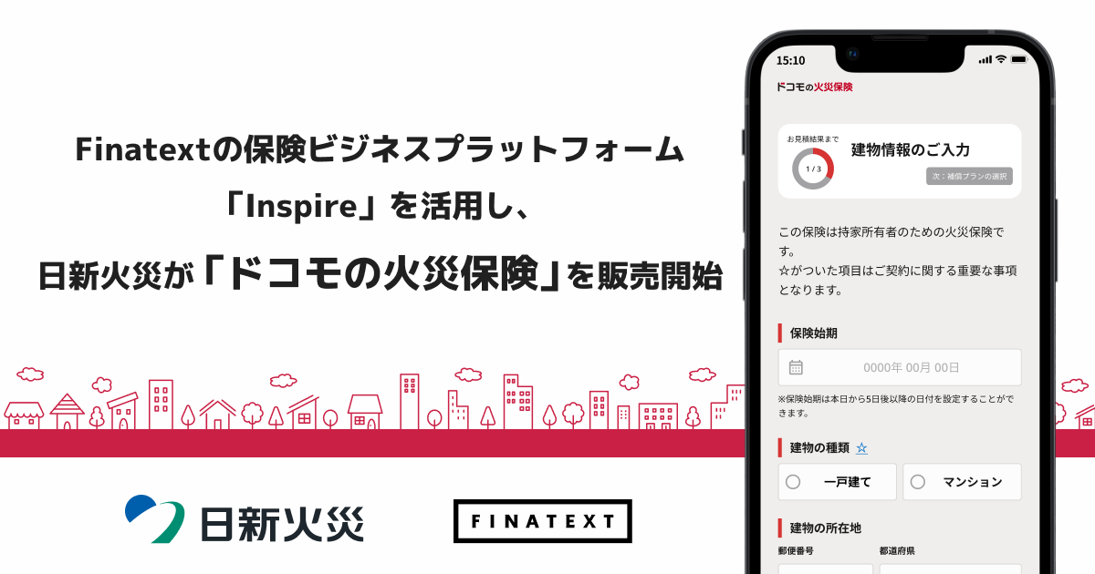 次世代金融インフラの提供を通して組込型金融を実現するFinatextグループの株式会社Finatext(本社:東京都千代田区、代表取締役CEO:木下 あかね、以下「当社」)は、当社の保険ビジネスプラットフォーム「Inspire(インスパイア)」を活用し、日新火災海上保険株式会社(本社:東京都千代田区、代表取締役社長:織山 晋、以下「日新火災」)が「ドコモの火災保険(正式名称:すまいの保険)」の販売を開始したことをお知らせします。