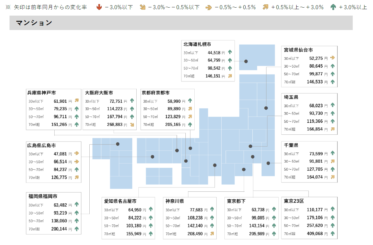 ●マンションの平均募集家賃は、首都圏全エリア(東京23区・東京都下・神奈川県・埼玉県・千葉県)および札幌市・仙台市・名古屋市・京都市・神戸市・福岡市の計11エリアが全面積帯で前年同月を上回る。