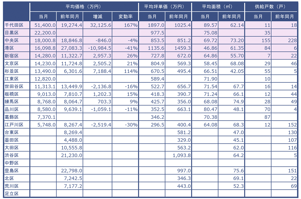 東京23区の各行政区毎に、平均価格、平均坪単価、平均面積、供給戸数をまとめました。当月の平均価格が大きい順に表示しています。