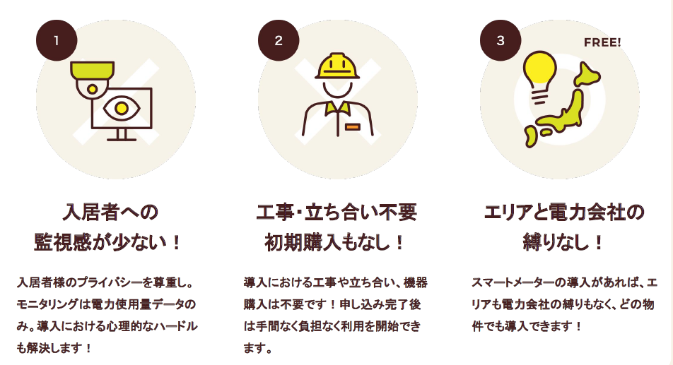 数ある見守りサービスのなかで「らくもり」が選ばれる背景には、「導入のしやすさ」と「プライバシーへの配慮」があります。カメラや専用センサーを室内に設置するのではなく、各家庭に設置されている「スマートメーター(通信機能を備えた新しい電力メーター)」のデータを活用するため、大掛かりな設置工事が不要です。低コストかつ立ち会いなしで導入できるため、新たに入居される方だけでなく、すでに入居中の高齢者の方への後付け導入も容易であり、これが管理会社による一括導入を後押ししています。