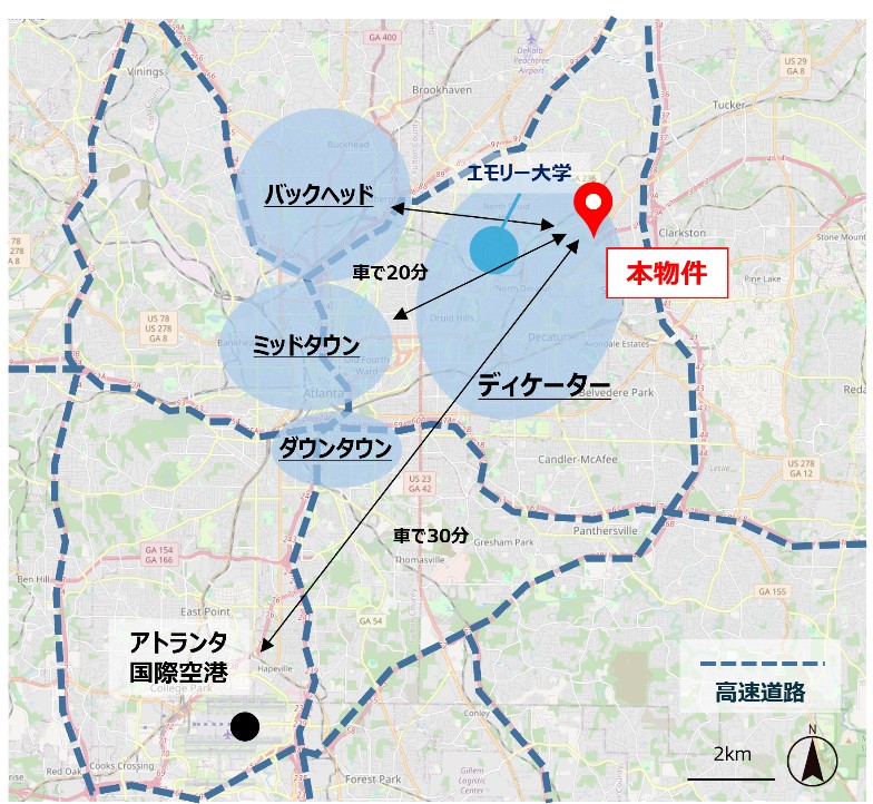 本物件は、都市圏中心部から北東に約10kmの「ディケーターエリア」に位置しています。大企業やスタートアップが集積する、ミッドタウンやバックヘッドに車で約20分と交通利便性に優れているため、住宅街として人気のエリアです。周辺には、1836年設立の総合大学エモリー大学をはじめとする多数の教育施設や医療機関が集積しており、人口の増加にともなう継続的な住宅需要が期待できます。