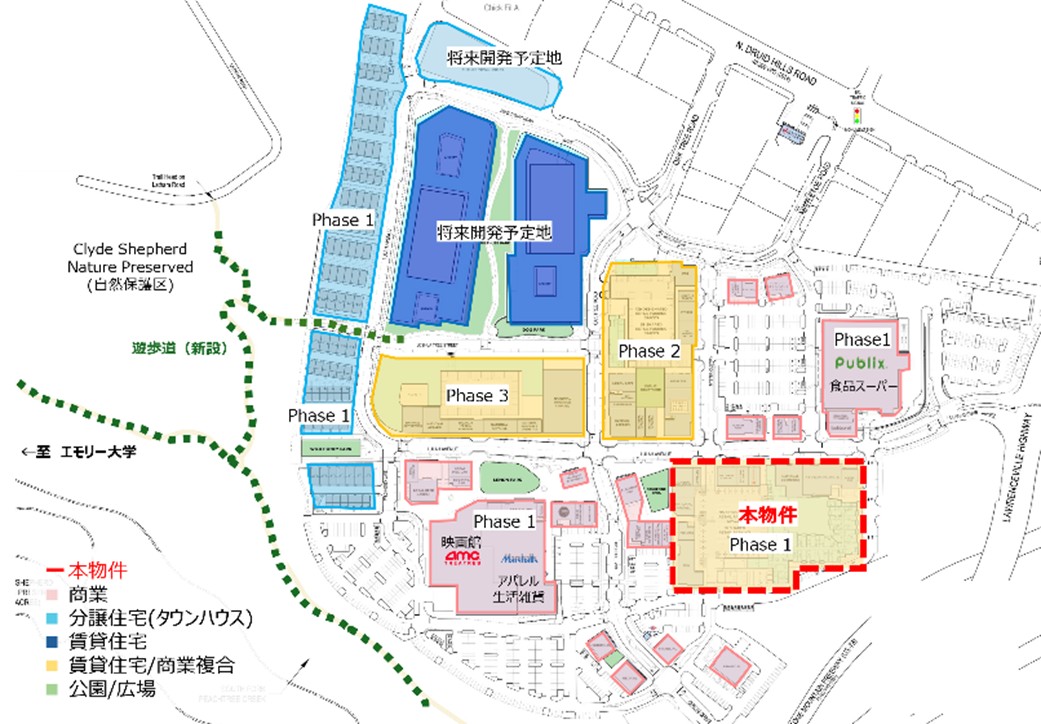 また本物件は、米国大手商業デベロッパーであるEDENS社が、ショッピングモール跡地の再開発事業として進めている大規模複合開発Lulah Hillsの一画を構成しています。Lulah Hillsは全体30ha超の敷地に、スーパーマーケットや映画館など多様な商業施設や約1,800戸の住宅の開発を行い、エモリー大学や近隣の自然保護区に繋がる遊歩道も整備される予定です。本物件は、Lulah Hills内で着工する最初の賃貸住宅となります。