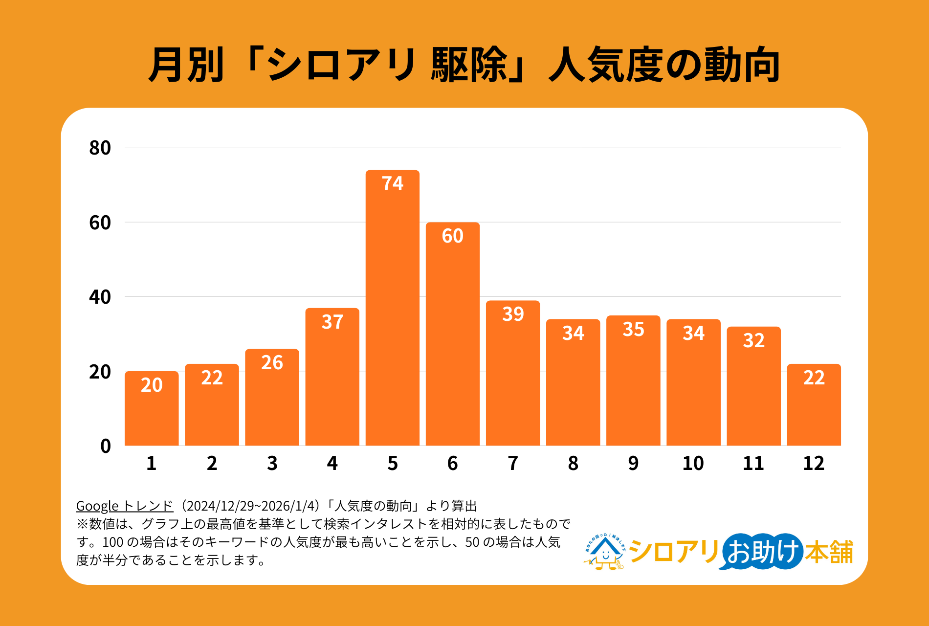 Googleトレンドによると、「シロアリ 駆除」の検索ボリュームは4月初旬から増え始め、5月から6月にピークを迎えます。この傾向はシロアリの活動時期に連動しています。