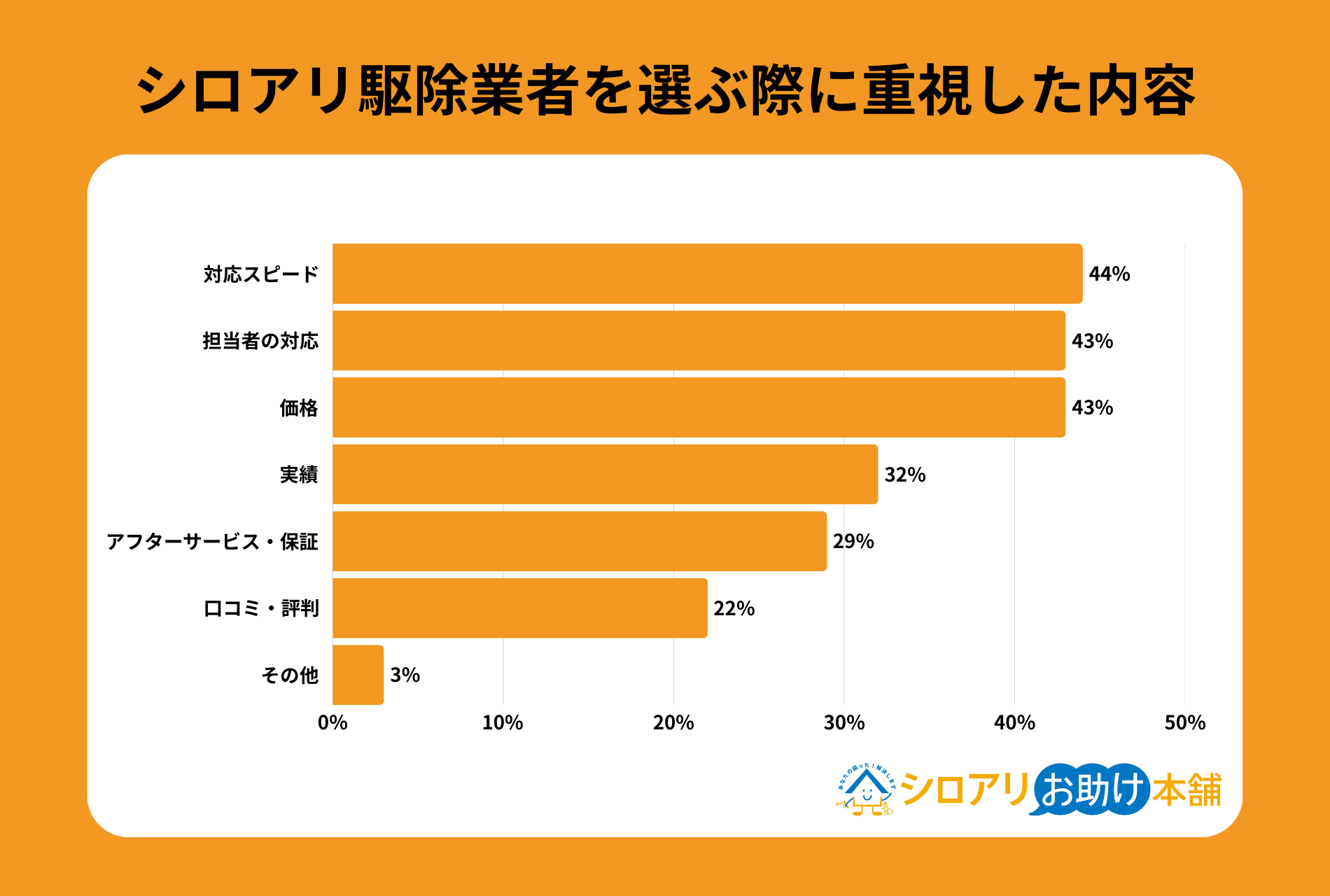 シロアリ駆除業者を選ぶ際に重視した内容について調査したところ、「対応スピード」(44%)、「担当者の対応」(43%)、「価格」(43%)がほぼ同率でトップ3となりました。続いて「実績」(32%)、「アフターサービス・保証」(29%)、「口コミ・評判」(22%)という結果でした。