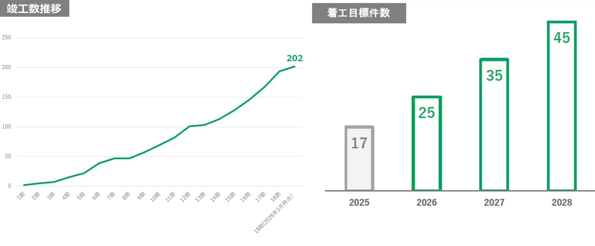 当社グループは、2008年に創業し、事業を拡大してきました。その拡大に伴って各プロセスの内製化を進め、投資用新築一棟賃貸マンションに特化した、用地仕入から設計・建築、賃貸仲介・管理、売買仲介、そしてエネルギー供給までを一貫して担う、独自の「不動産SPAモデル」を強みにしています。この度、オーナー様をはじめとする皆様に支えていただきながら、着実に着工を進めていき、3月に竣工の5件の物件をもって、累計竣工数が202棟に到達し、200棟を突破いたしました。当社のビジネスモデルにおいて、竣工棟数の増加はストックビジネスである「管理受託戸数」の拡大に直結します。この度の200棟突破により、安定的な収益基盤も一層強固なものとなりました。