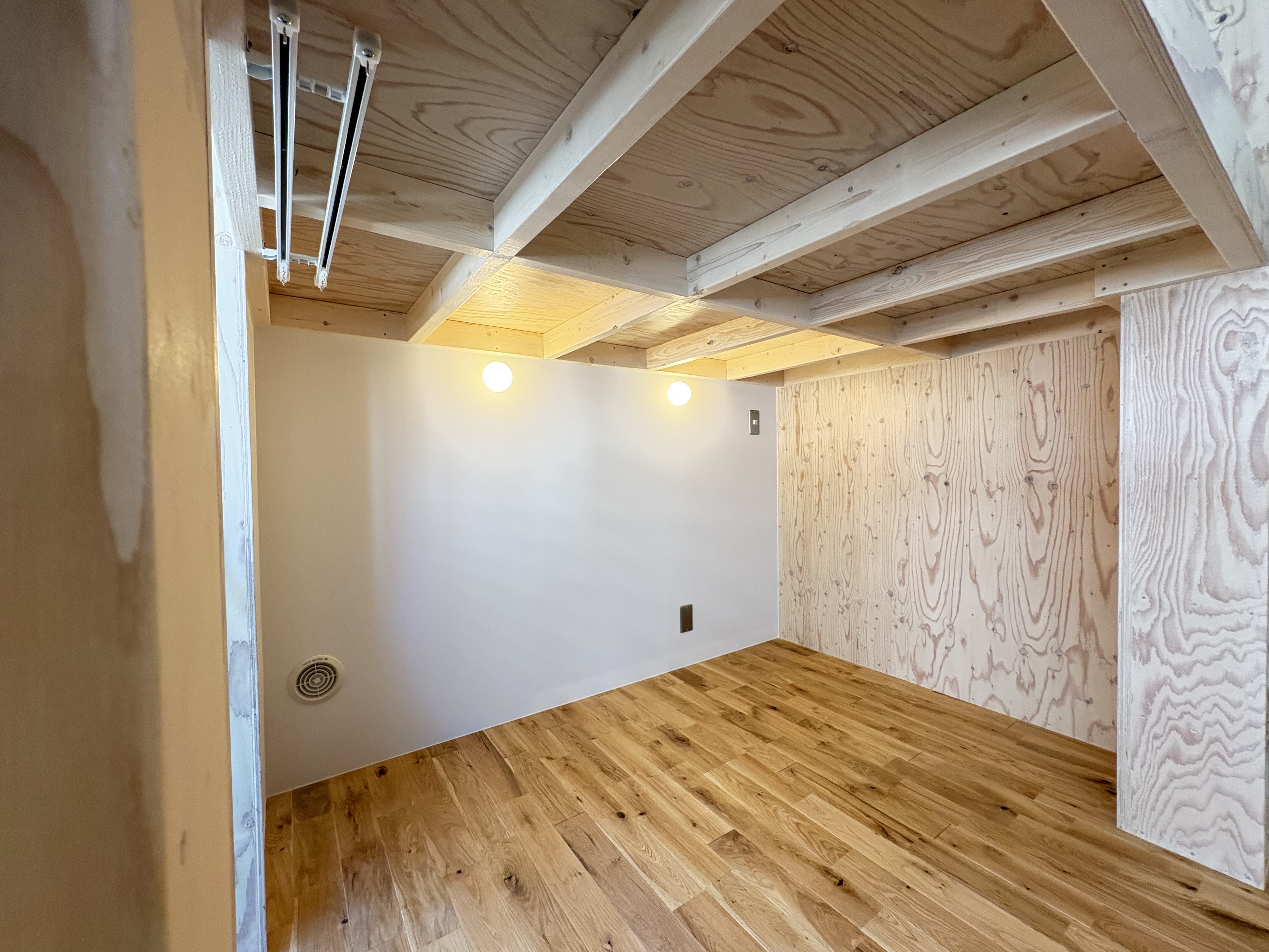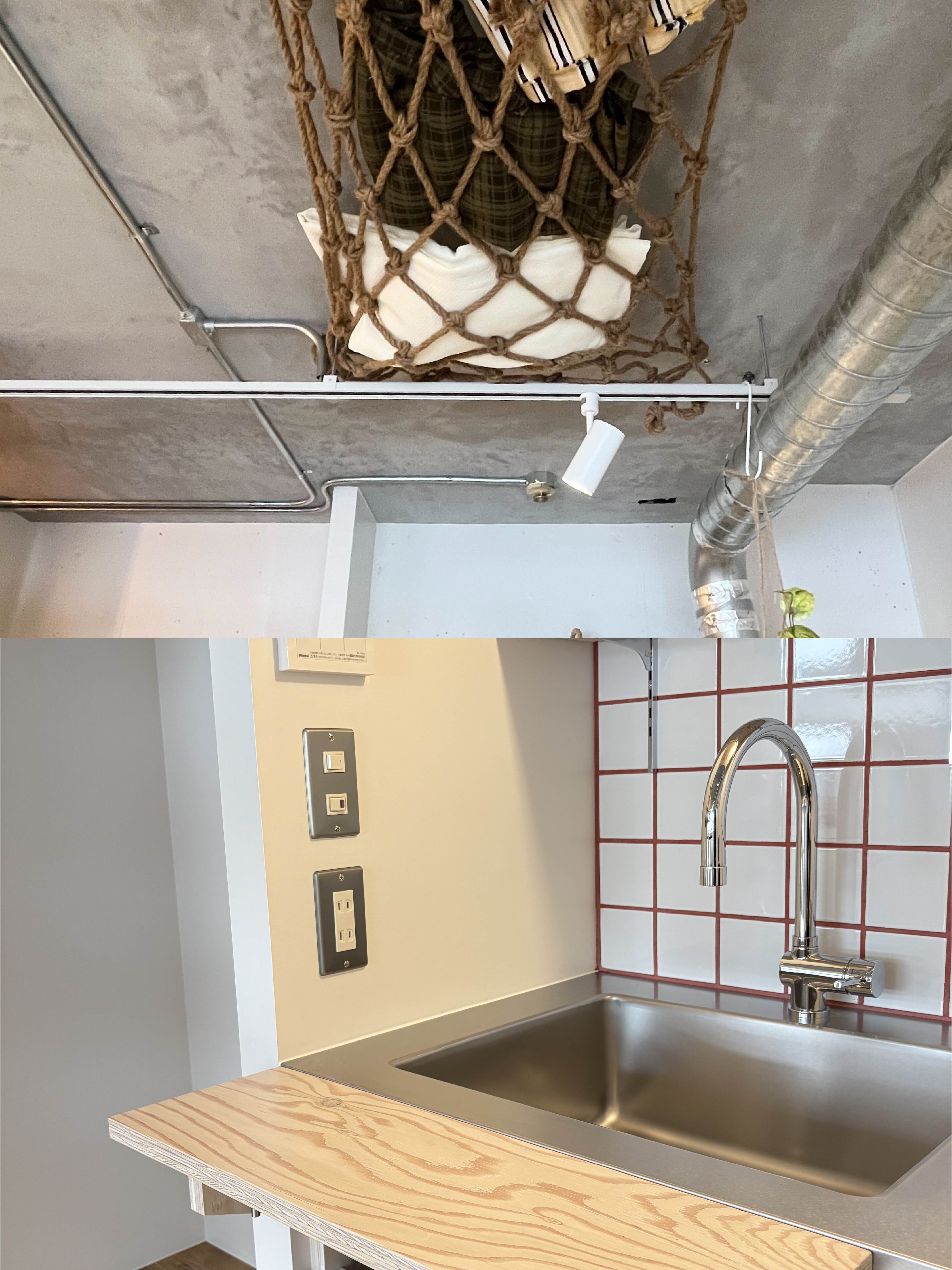 ロフト空間へはハシゴではなく収納棚に見える階段を造作。遊び心のある作りにし、同素材で統一感を演出しました。キッチンには拡張作業台がついており、必要なときに広げられるようになっています。天井にはネット収納を取り付け、空間全体が収納スペースとして使えるように。今回の裏テーマ「スペースマスター」の通り、限られた空間を最大限に活かせるお部屋となりました。