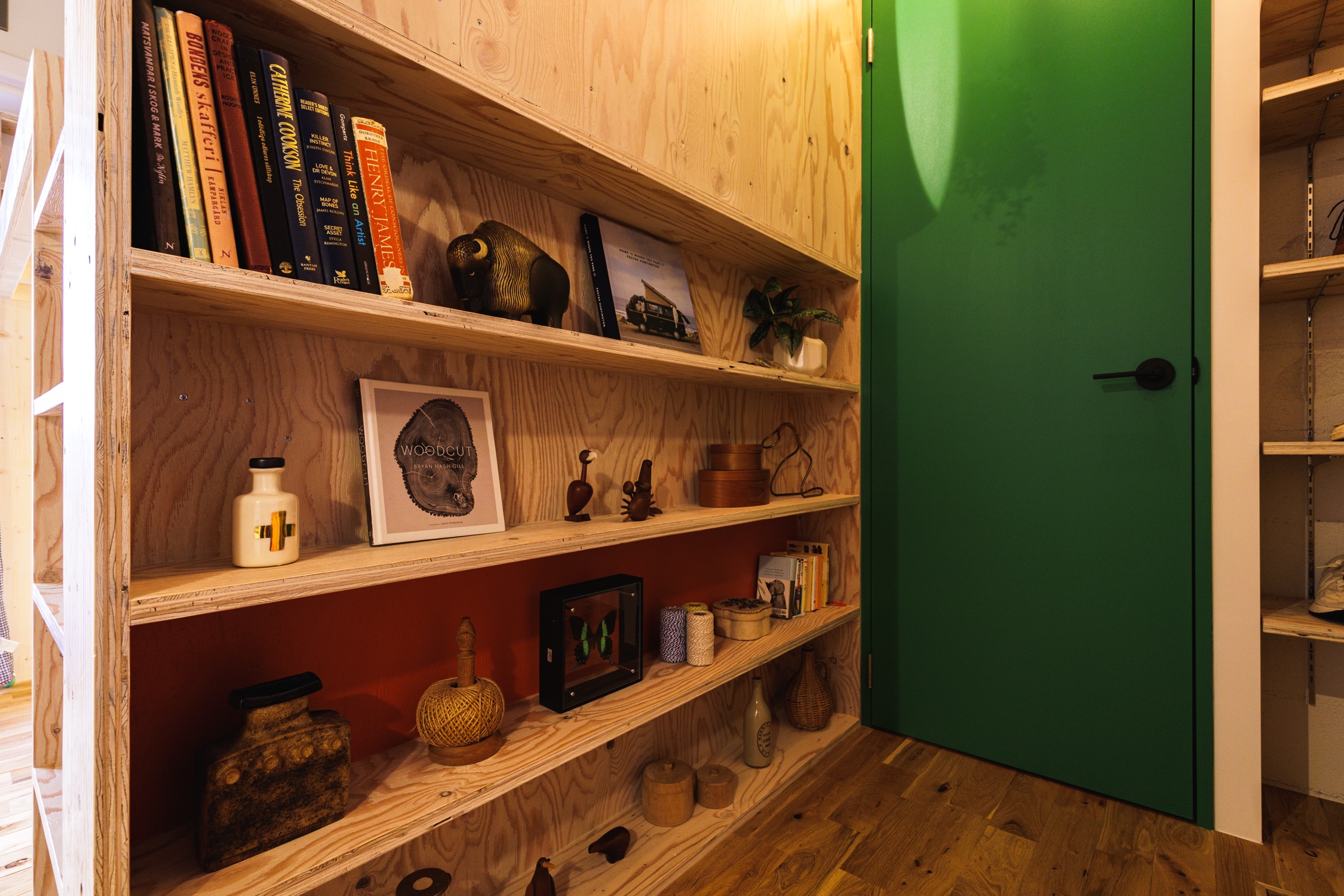 玄関を入り正面の飾り棚の一部には、温かみのあるオレンジのアクセントカラーをオン。洗練されたグリーンの扉との相性が良く、暮らす人の気持ちと空間を明るく包み込んでくれます。