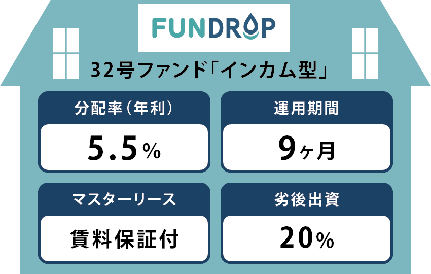 FUNDROP 32号ファンドは、利回り(年利)5.5%、賃料保証付きにて運用