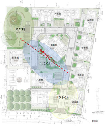 1.「のこす・つなぐ・ひらく」をコンセプトに、既存資源を活用し、地域と調和した新しい街並みを創出