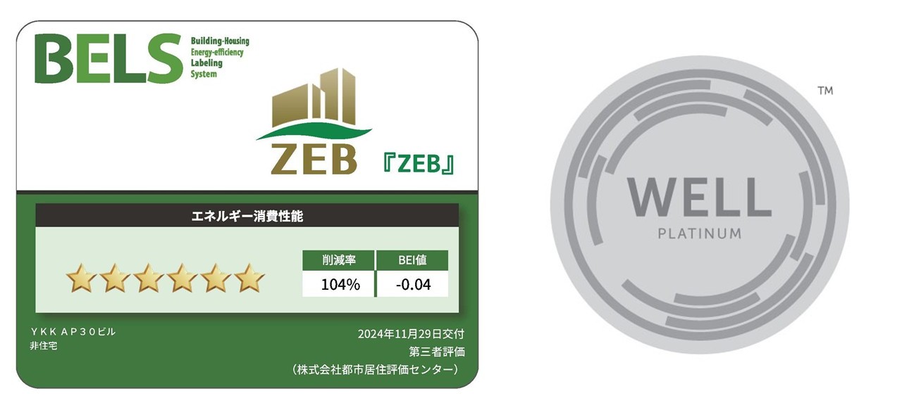 YKK AP 株式会社(本社:東京都千代田区、社長:魚津 彰)は、製造部門の本部機能および本社機能の一部のオフィスを構えるYKK AP30ビル(富山県黒部市)が、建物で消費する年間の一次エネルギーの収支を正味ゼロ以下にする『ZEB』(※1)、および建物で働く人の健康・幸福に焦点を当てた国際評価制度「WELL Building Standard™(以下、WELL認証)」(※2)最高ランクのプラチナを取得しましたので、お知らせします。これを記念して3月中旬、同ビル敷地に竣工銘板を設置しました。