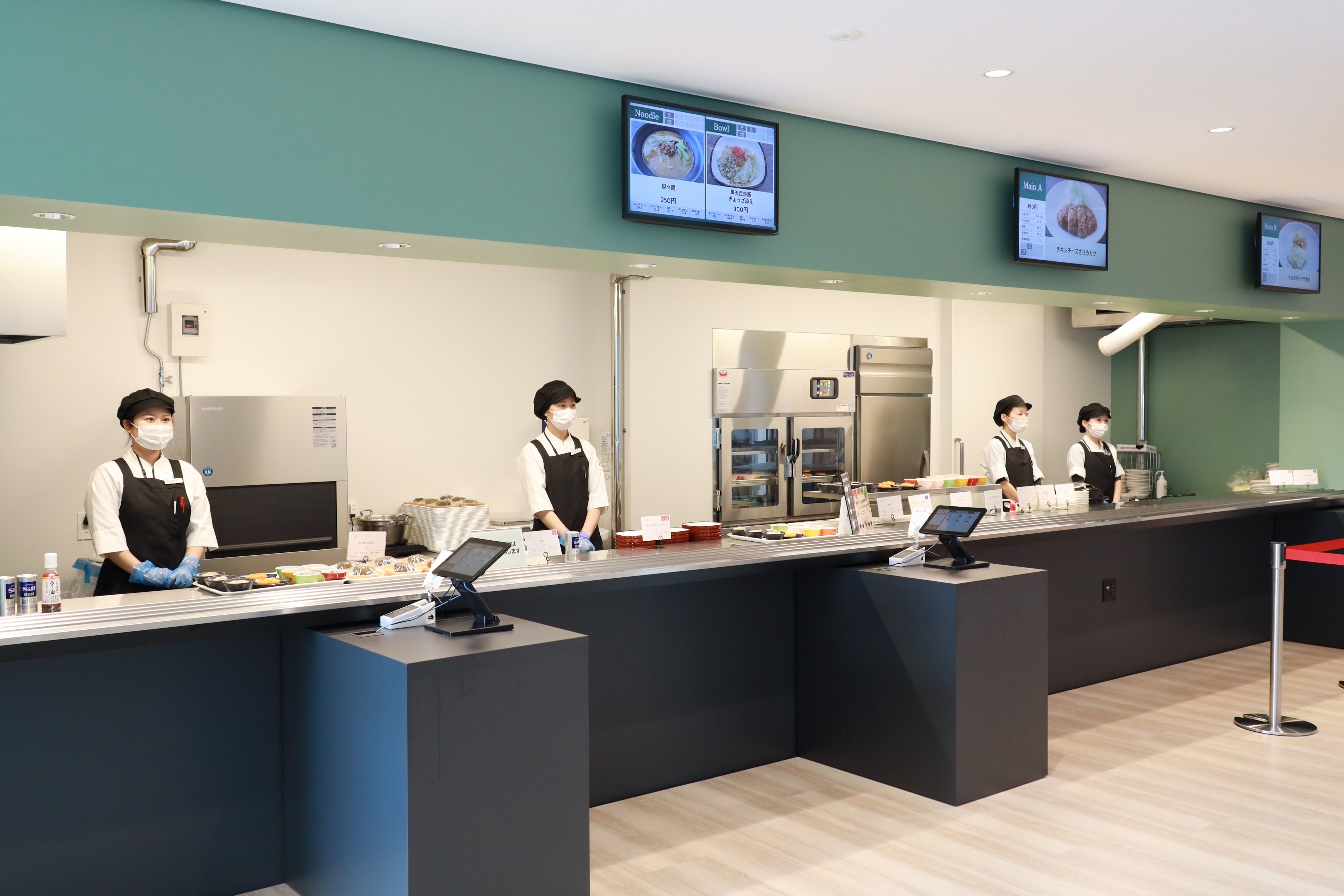 自律的な働き方「EBW」(※5)の一環として、3階のカフェテリア(社員食堂)では地元の旬の食材や調味料を採用し、栄養成分やアレルギー表示を行うなど安全・安心な食事を提供しています。その他、黒部川を描いた階段アートやガラス面に描いた山の稜線など、自然を身近に感じながら地域への愛着と親しみを醸成しています。ジェンダーギャップの軽減として、生理用品を無料提供する個室設置型インフラ「OiTr」(オイテル)を北陸で初めて導入。一人ひとりの働きやすさを追求し、ウェルビーイングの向上を目指しています。